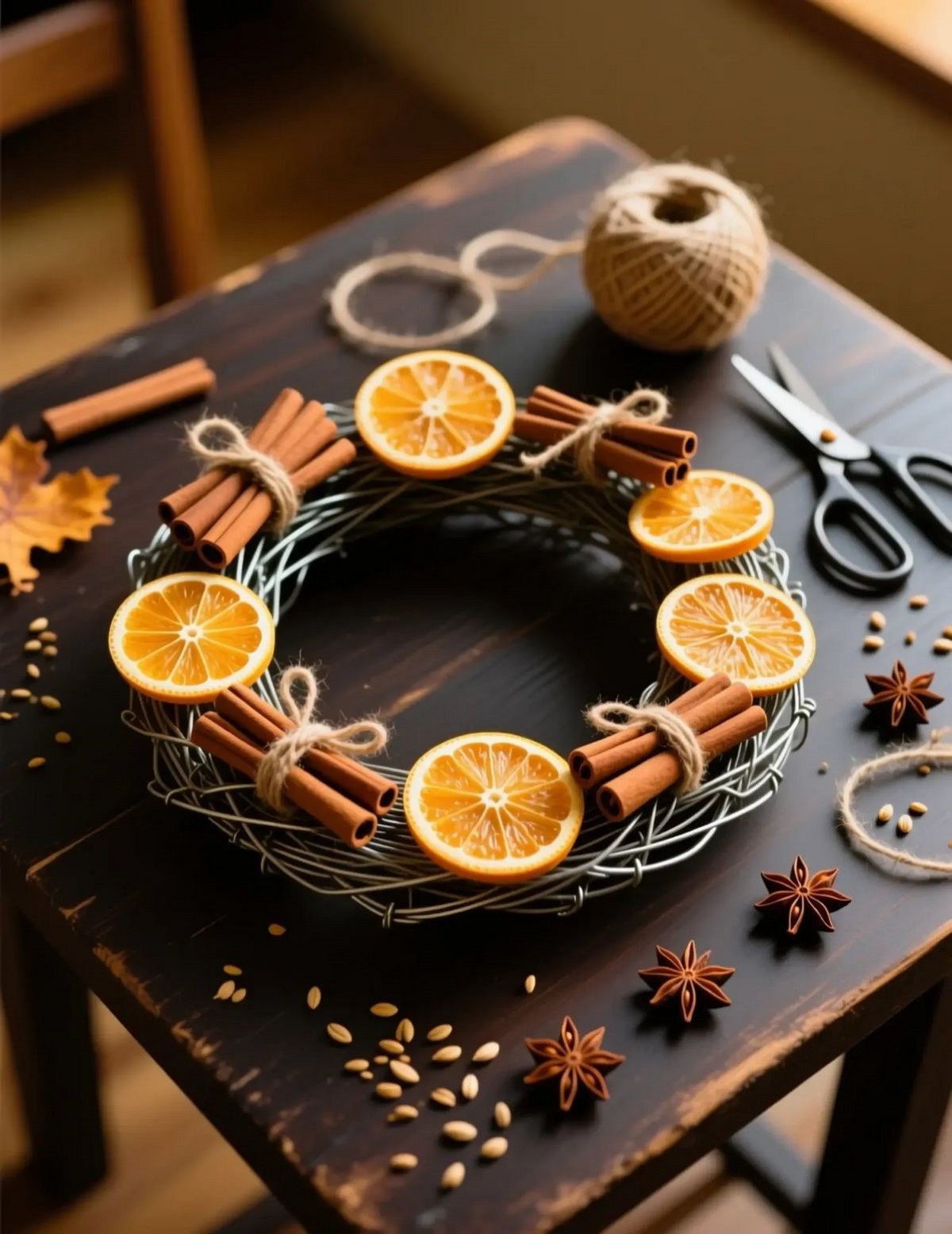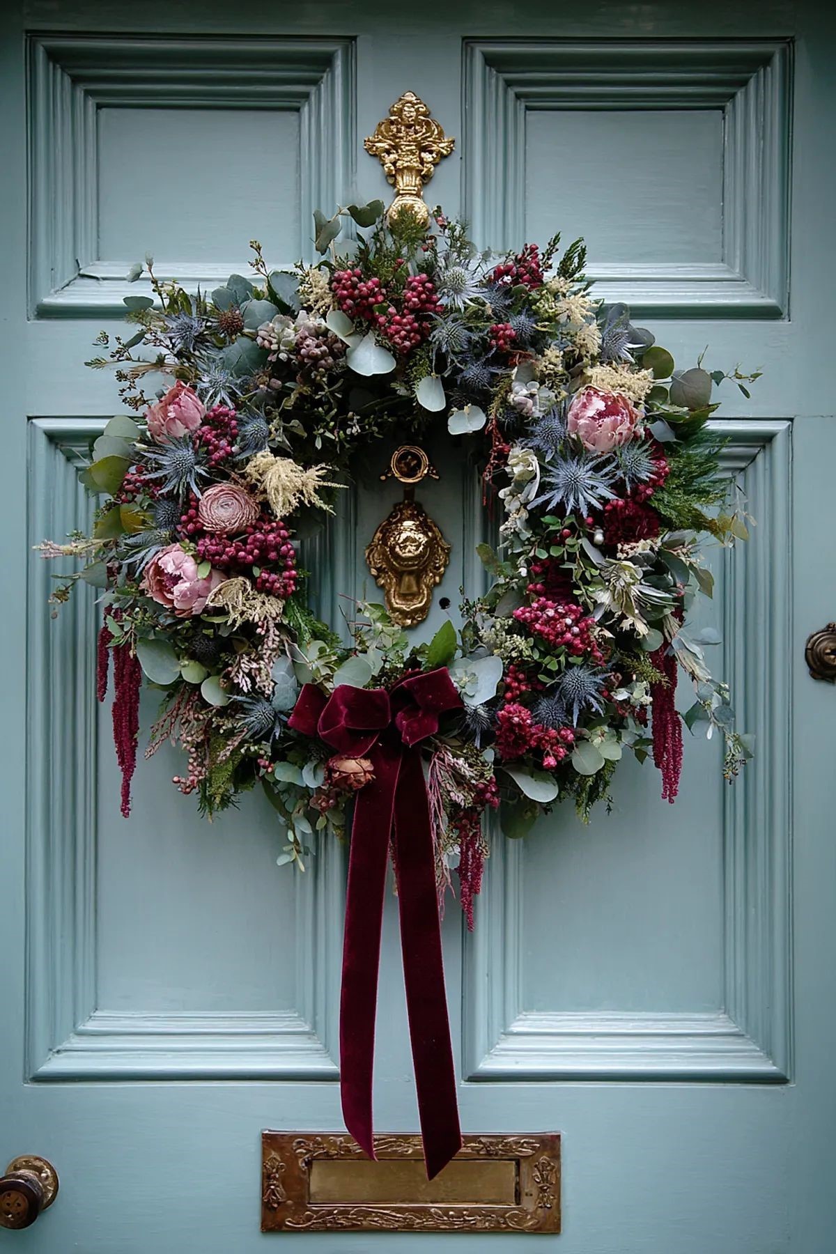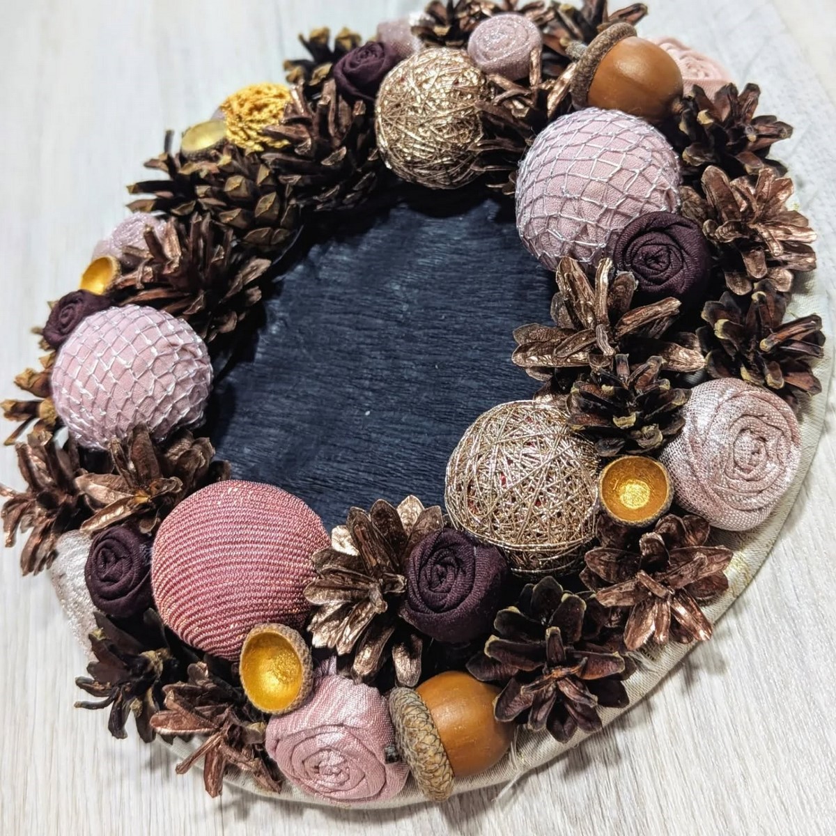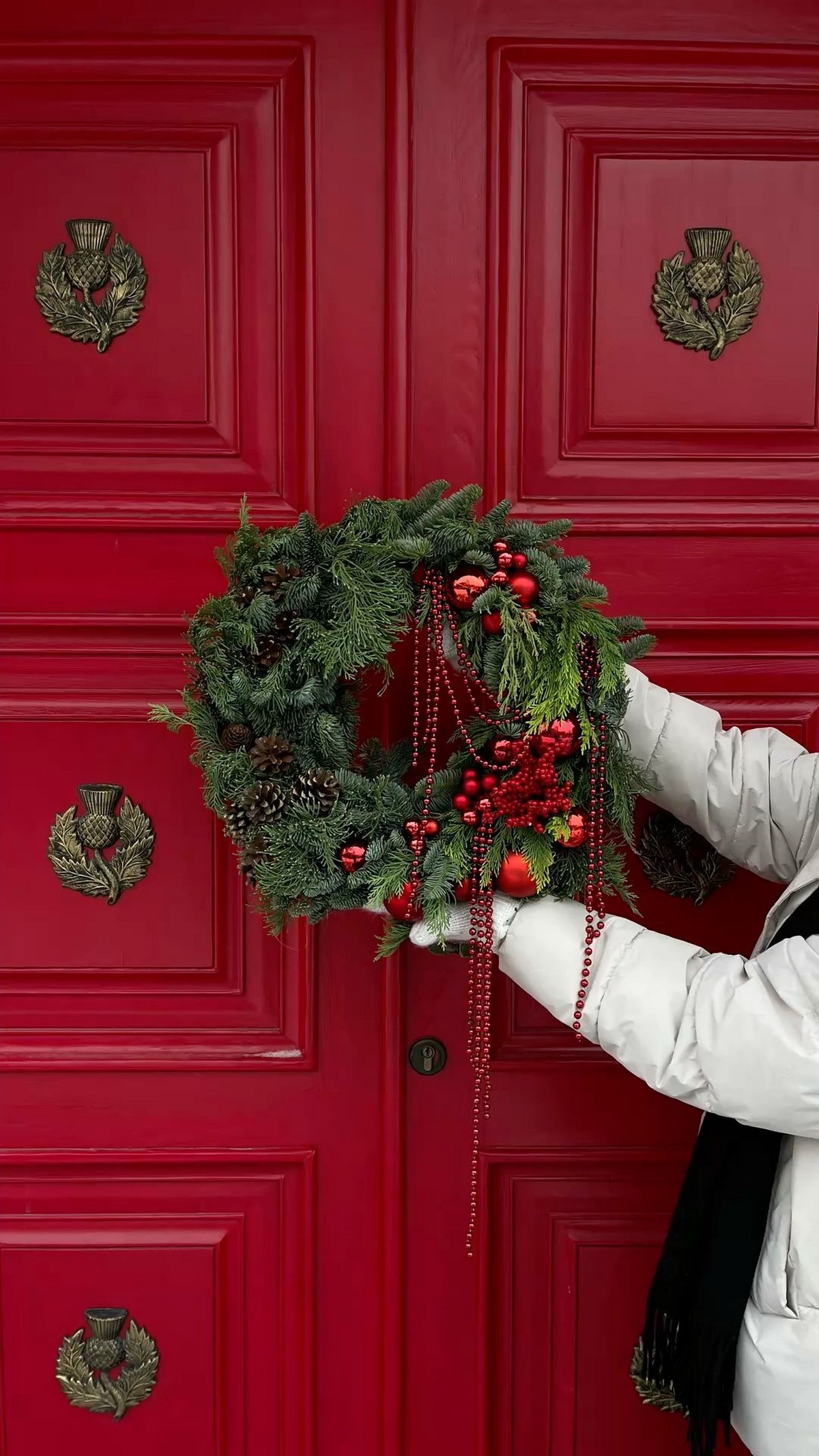 Новогодний венок в 2026 году выполнен преимущественно из натуральных материалов: хвоя, эвкалипт, еловые шишки, корица. Цвет — преимущественно природный с лёгким серебристым инеем.
