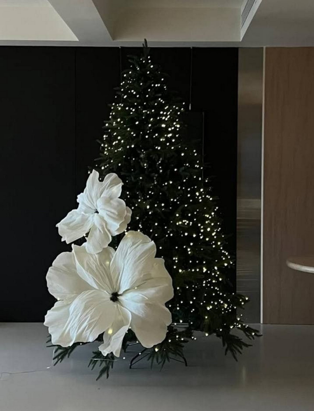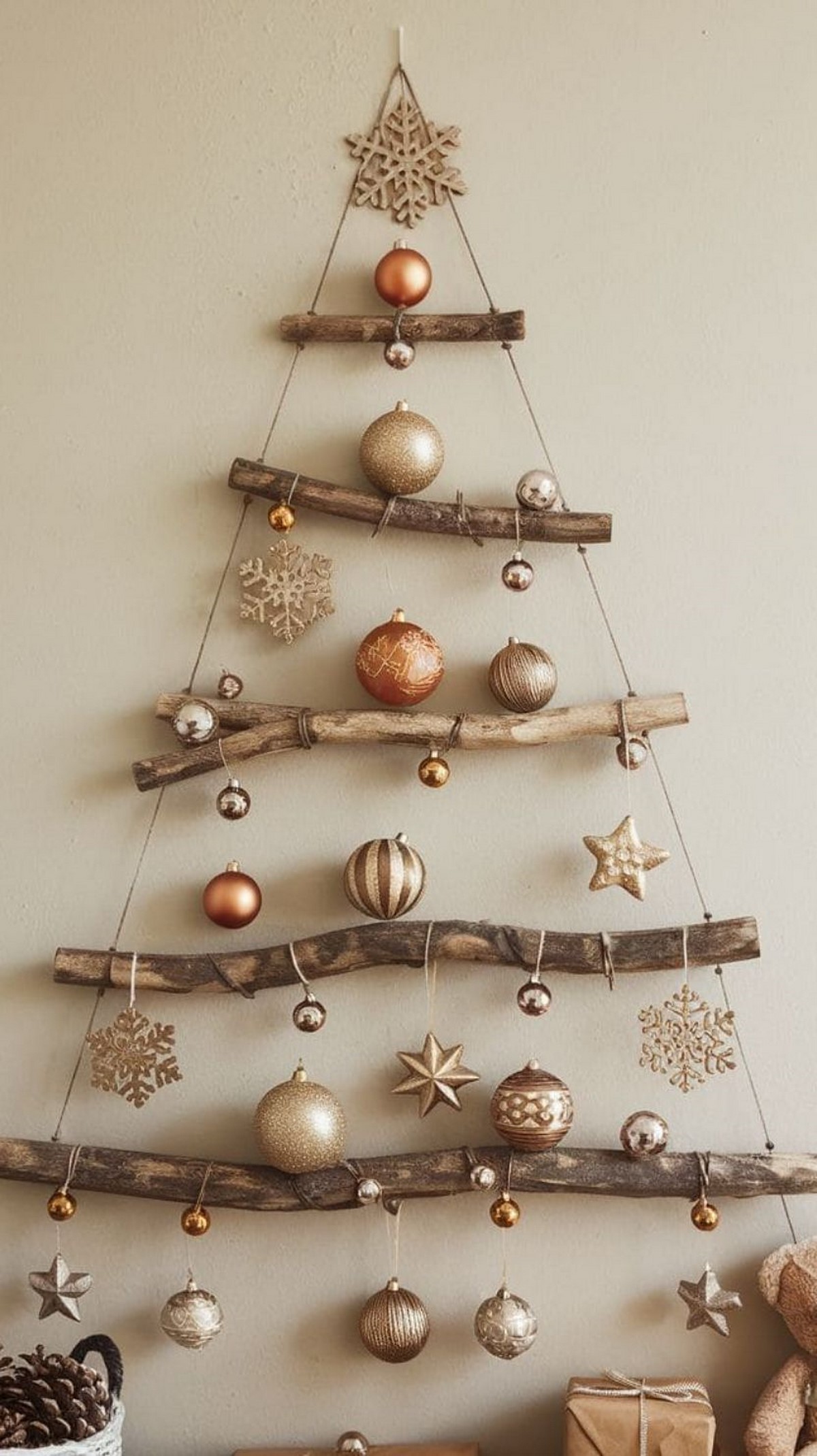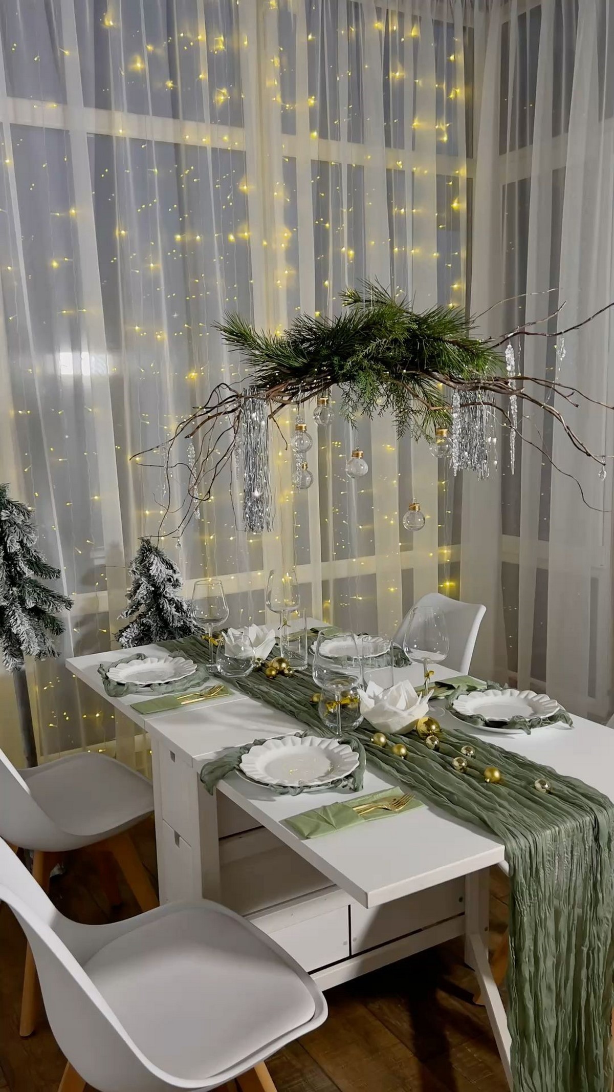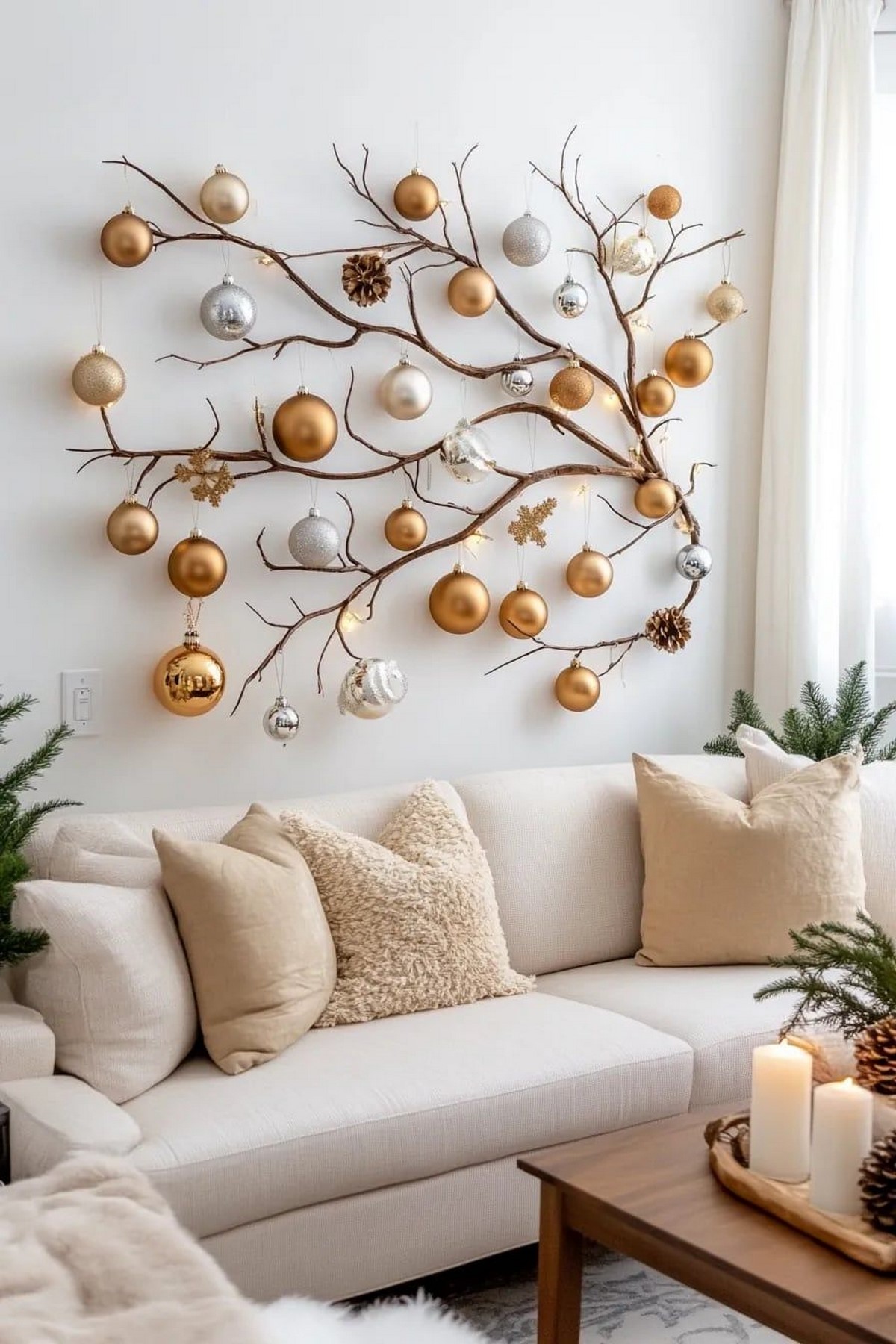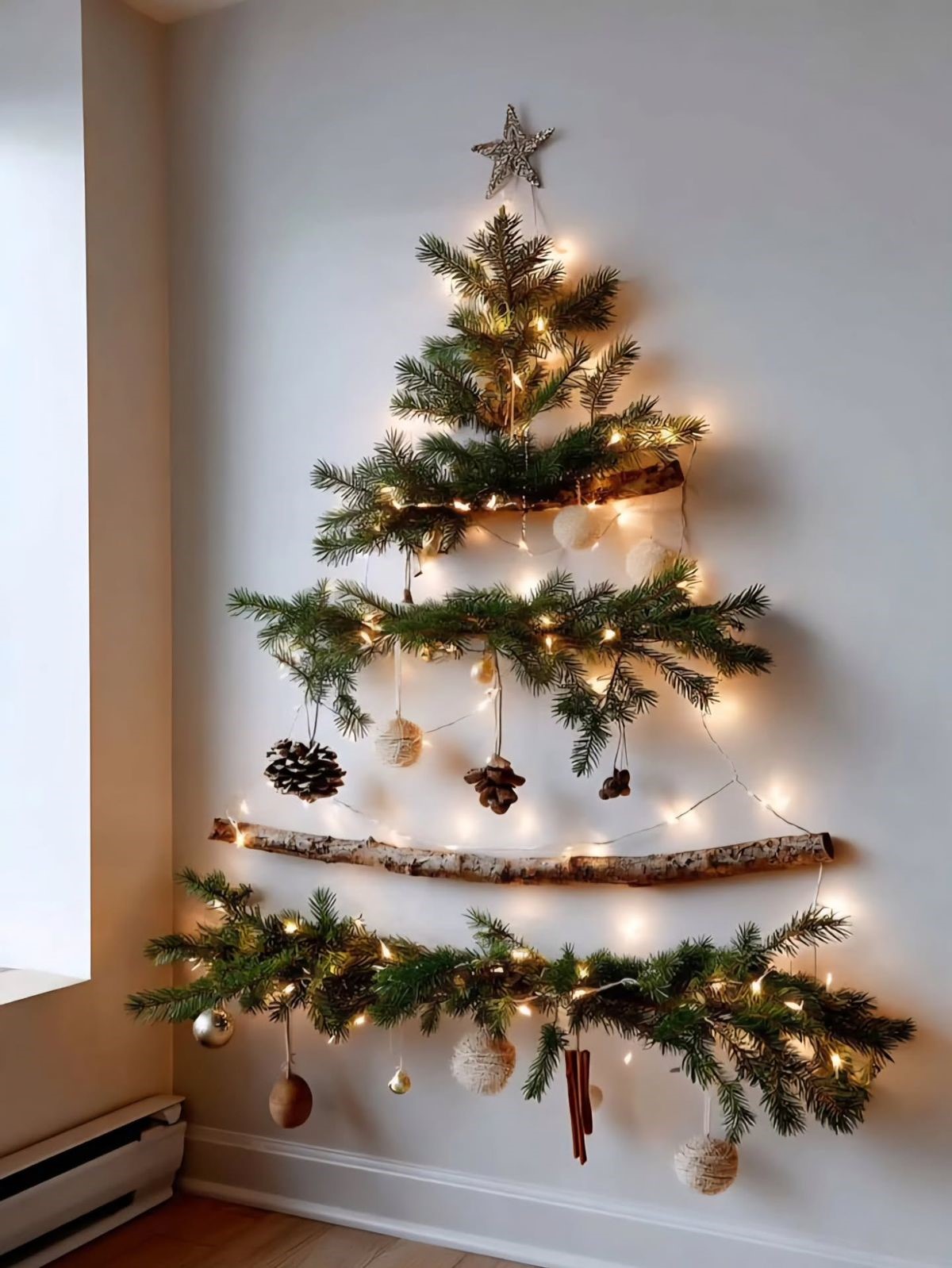 Стены украшают минималистичными композициями — ветви туи или эвкалипта, световые инсталляции, рамки с новогодними принтами. В моде — аккуратные вертикальные гирлянды и световые капли.