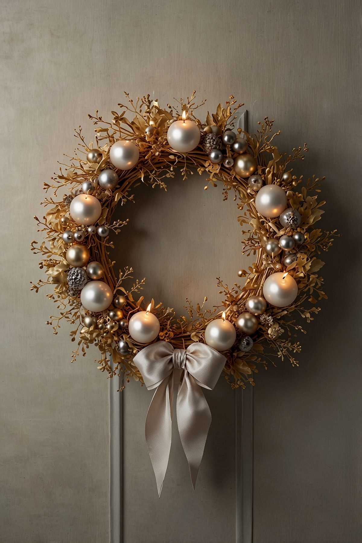 Композиции со свечами могут дополняться еловыми лапами, стеклянными шарами и металлическими подсвечниками визуально холодных оттенков.
