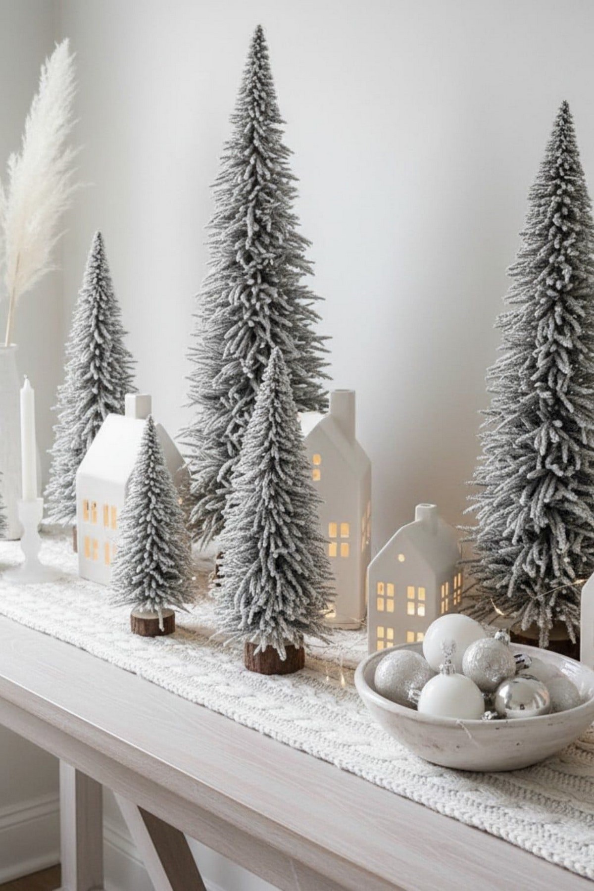 Для комодов тренд — минималистичный «зимний натюрморт»: одна декоративная ёлка, небольшая лампа, свеча и пара игрушек. В 2026 году перегружать поверхность большим количеством мелких предметов не модно.
