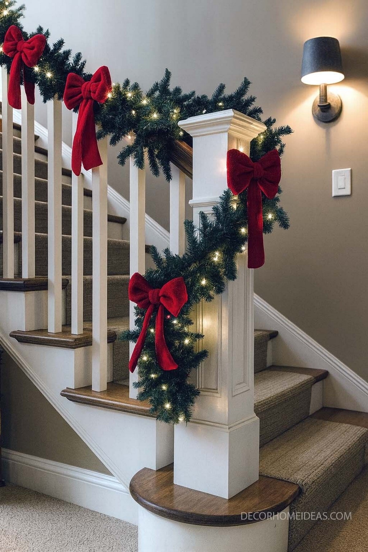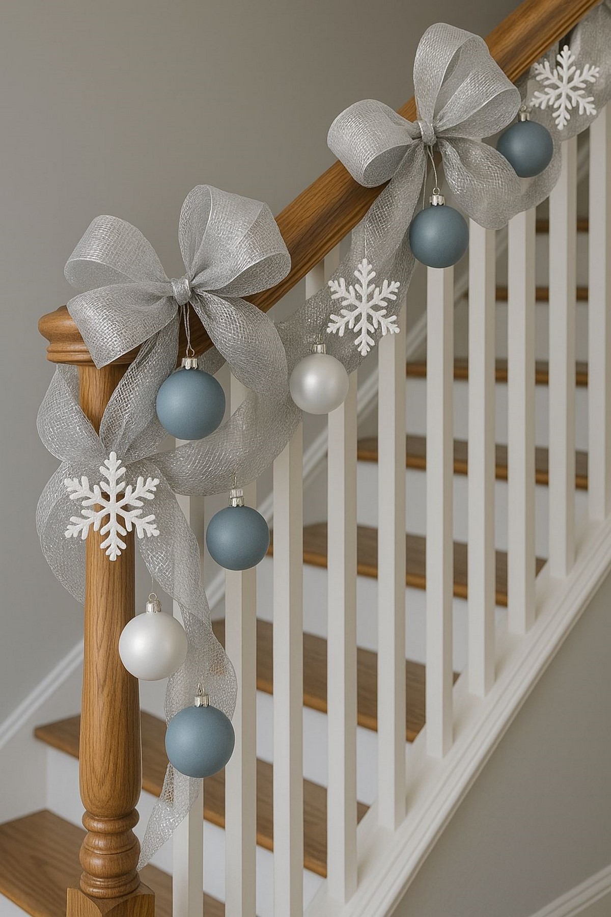 Не пропусти: Бархатные ленты — главный акцент лестничного декора 2026. Один элемент, повторённый по всей длине, выглядит намного дороже, чем множество разрозненных украшений.
