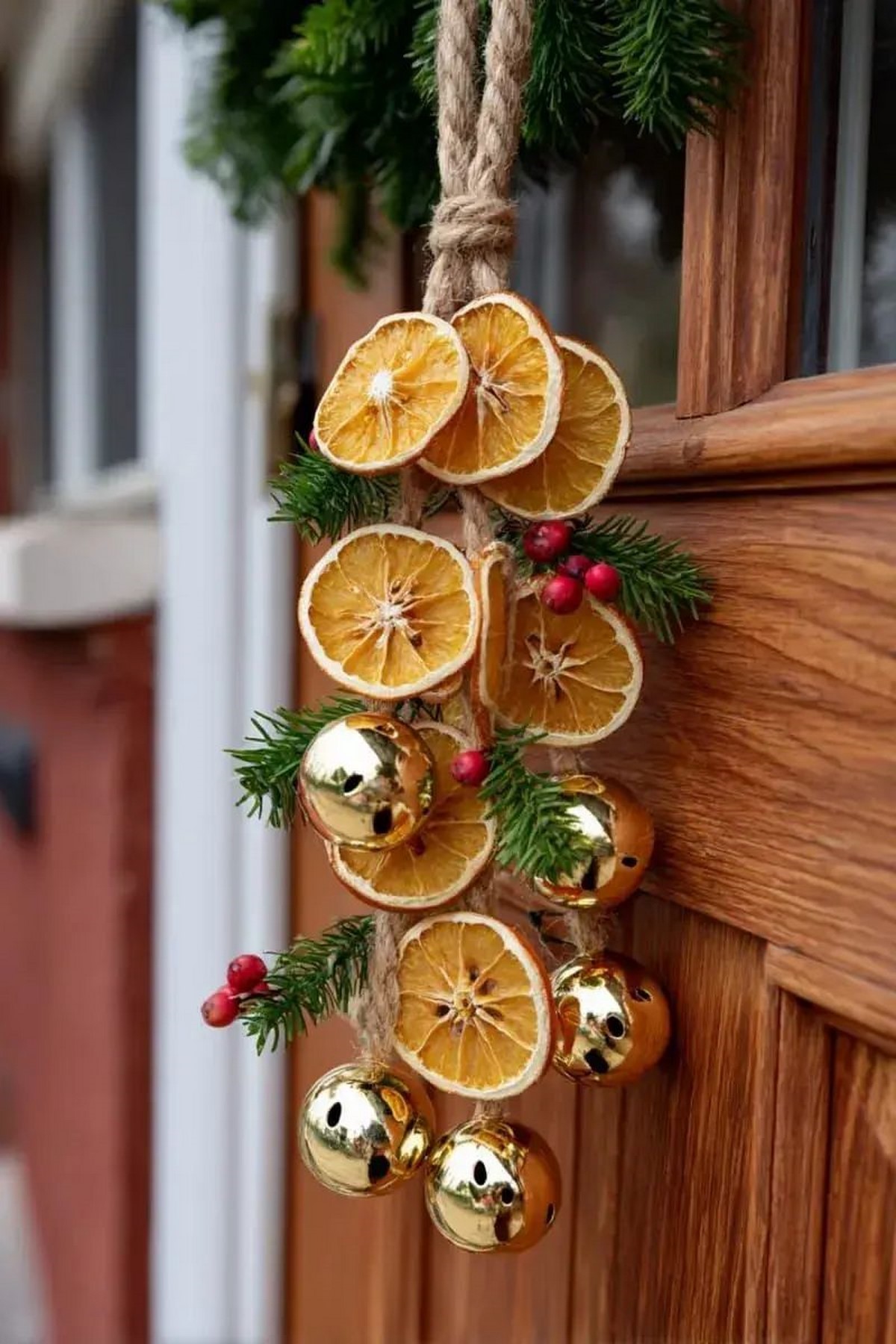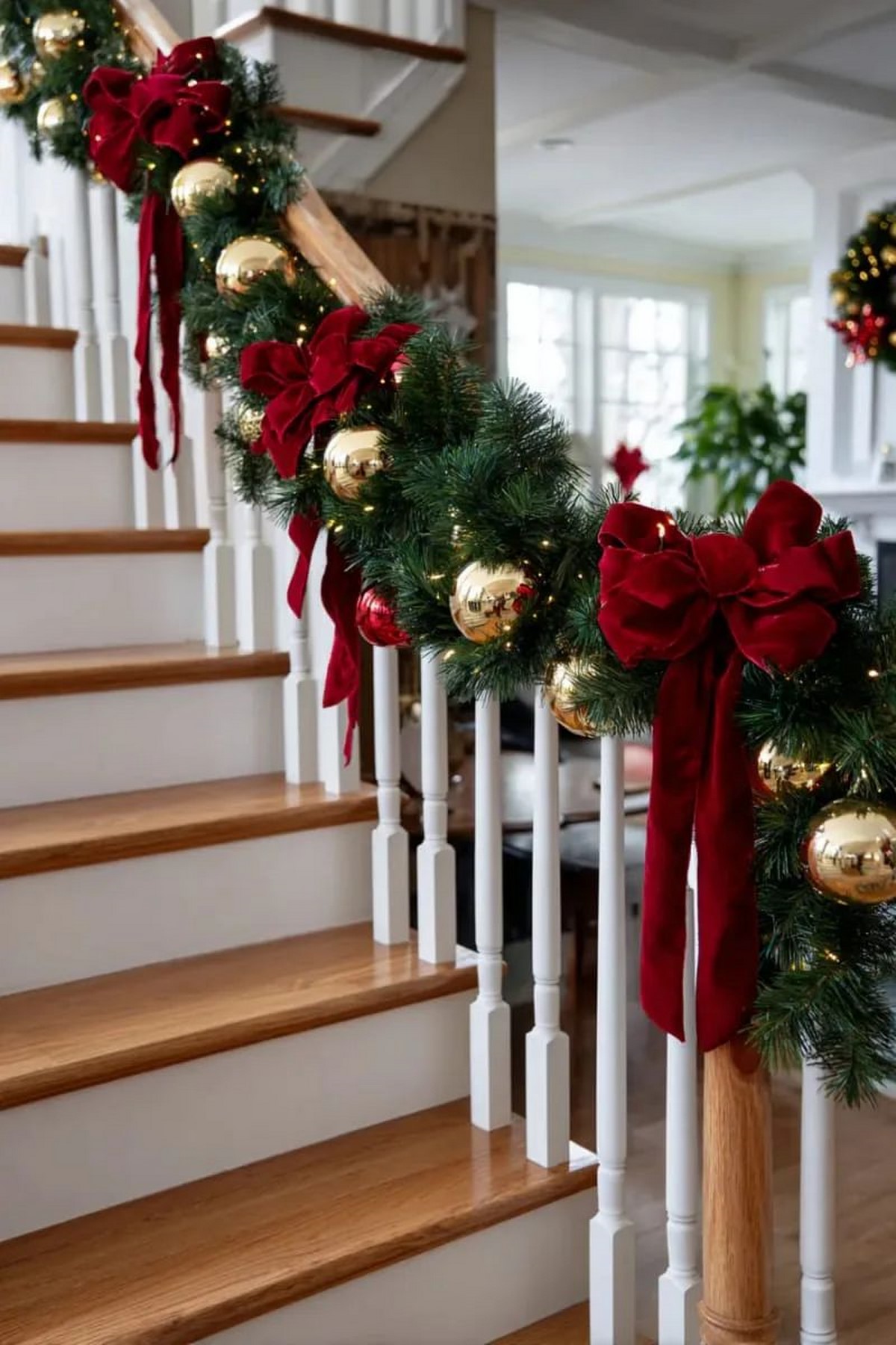 Лестницы украшают живыми хвойными гирляндами, длинными бархатными лентами и мягким тёплым светом. Тренд — «натуральная элегантность»: минимум пластика, максимум хвои и ткани.