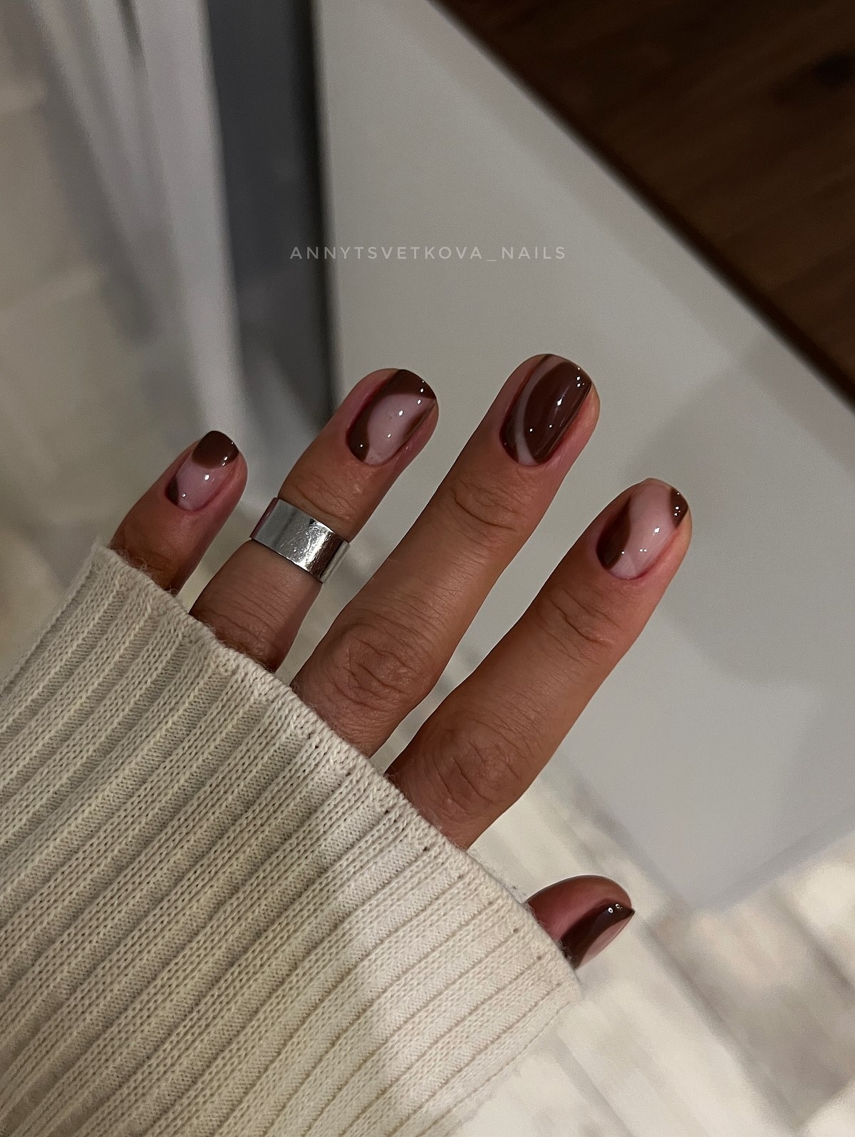 Шоколадный маникюр с элементами негативного пространства выглядит особенно стильно и современно. Прозрачные участки визуально облегчают темный оттенок, создавая ощущение аккуратности и графичности. Такой дизайн отлично смотрится на коротких и средней длины ногтях.