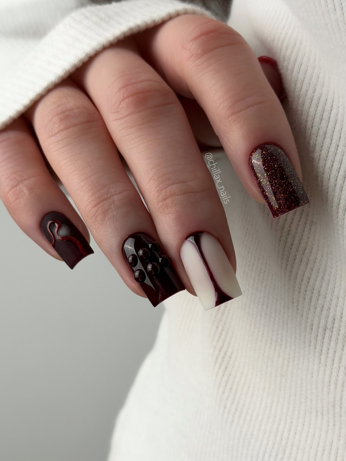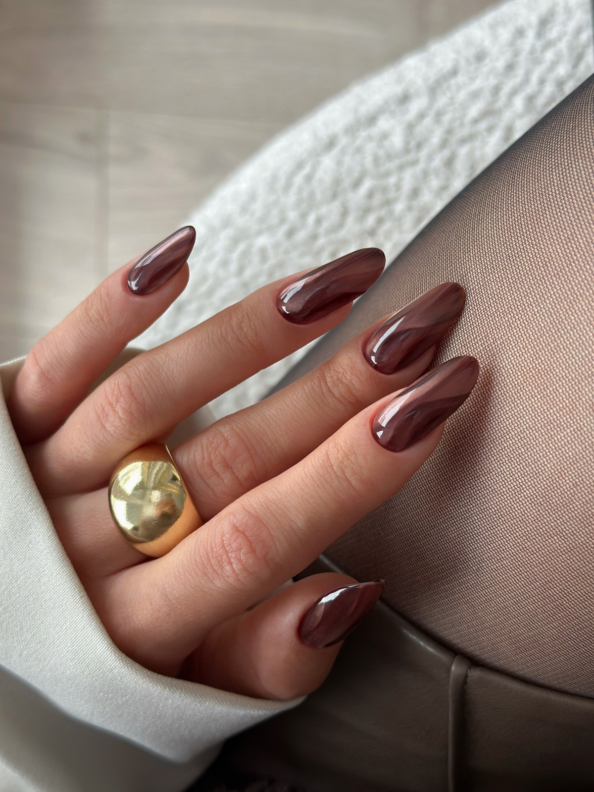 Шоколадный маникюр зимой 2026 представлен в разнообразных текстурах, оттенках и стилях. От глянцевых и матовых покрытий до сложных эффектов и графических решений, каждая идея подчеркивает глубину и универсальность коричневой палитры.