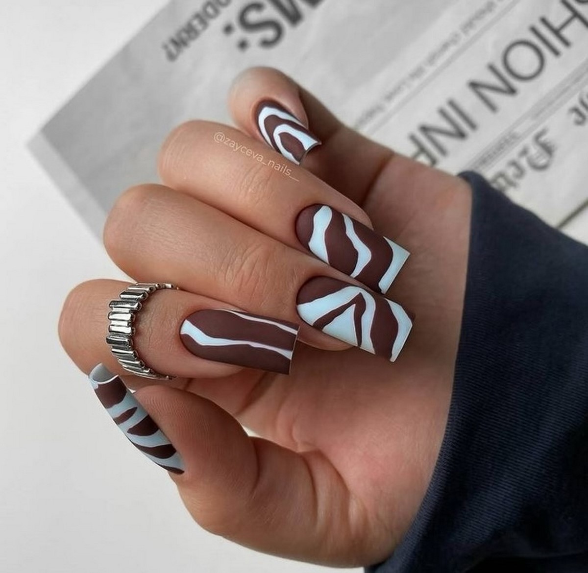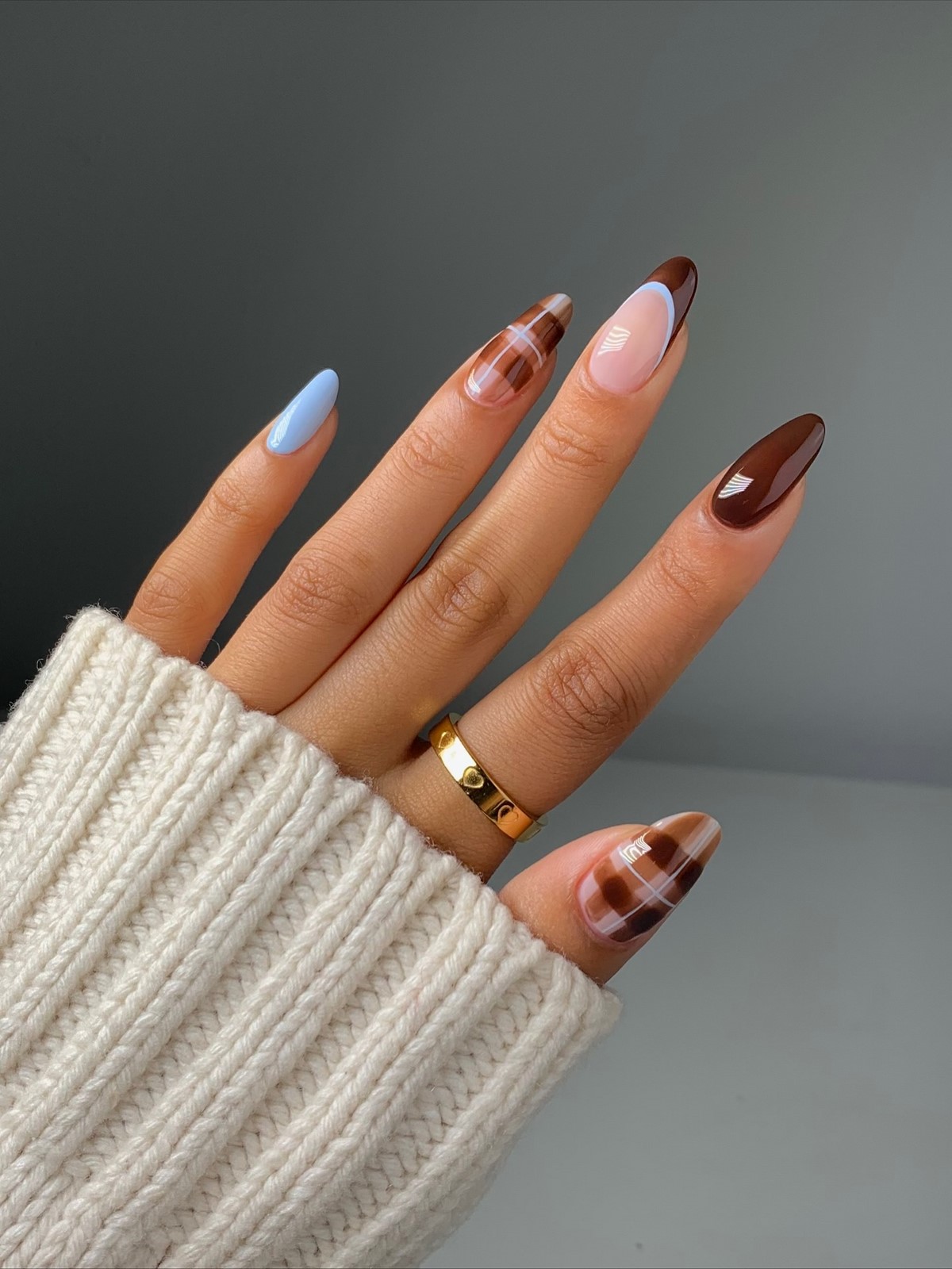 Сочетание шоколадного и голубого становится неожиданным, но очень гармоничным трендом зимы 2026. Холодный голубой оттенок создает выразительный контраст с теплой коричневой базой, делая маникюр визуально свежим.