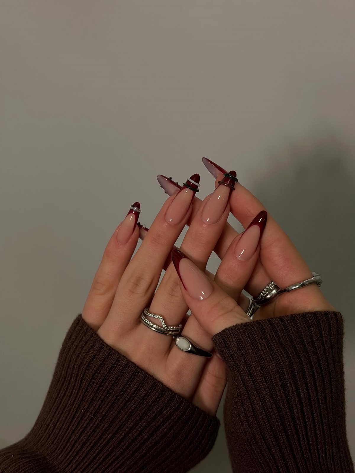 Шоколадный френч в зимнем сезоне 2026 становится более мягким и утонченным. Вместо резкого контраста используется сочетание коричневого с молочным, бежевым или нюдовым оттенком. Линия улыбки может быть классической или слегка смещенной.