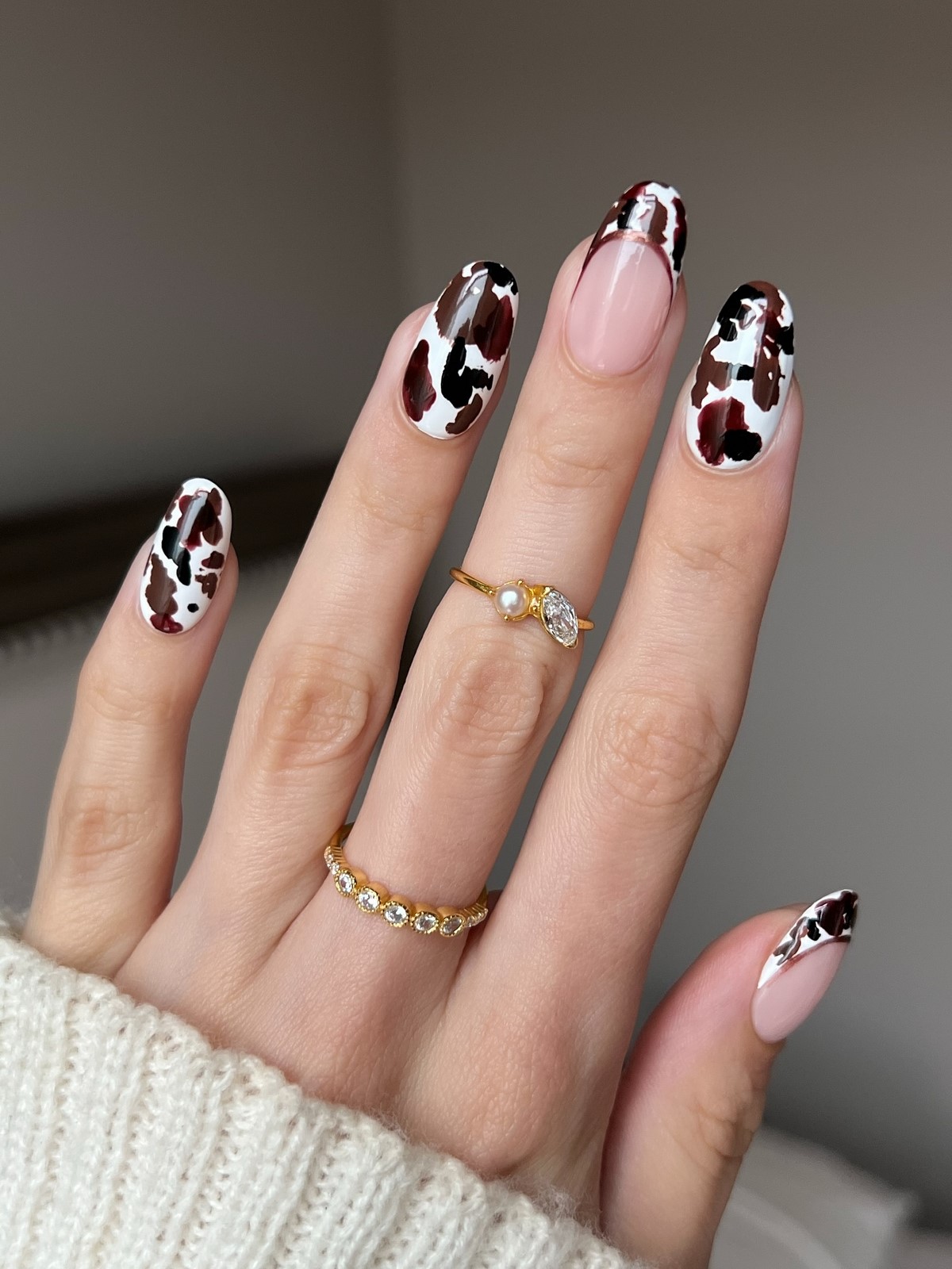 Горошек в шоколадной палитре становится мягким и уютным акцентом зимнего маникюра. Контрастные точки в молочном, карамельном или кремовом оттенке добавляют дизайну игривости, не нарушая общей элегантности.