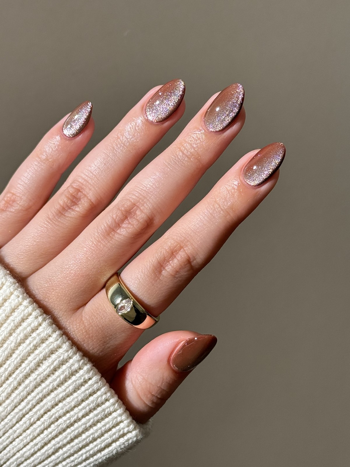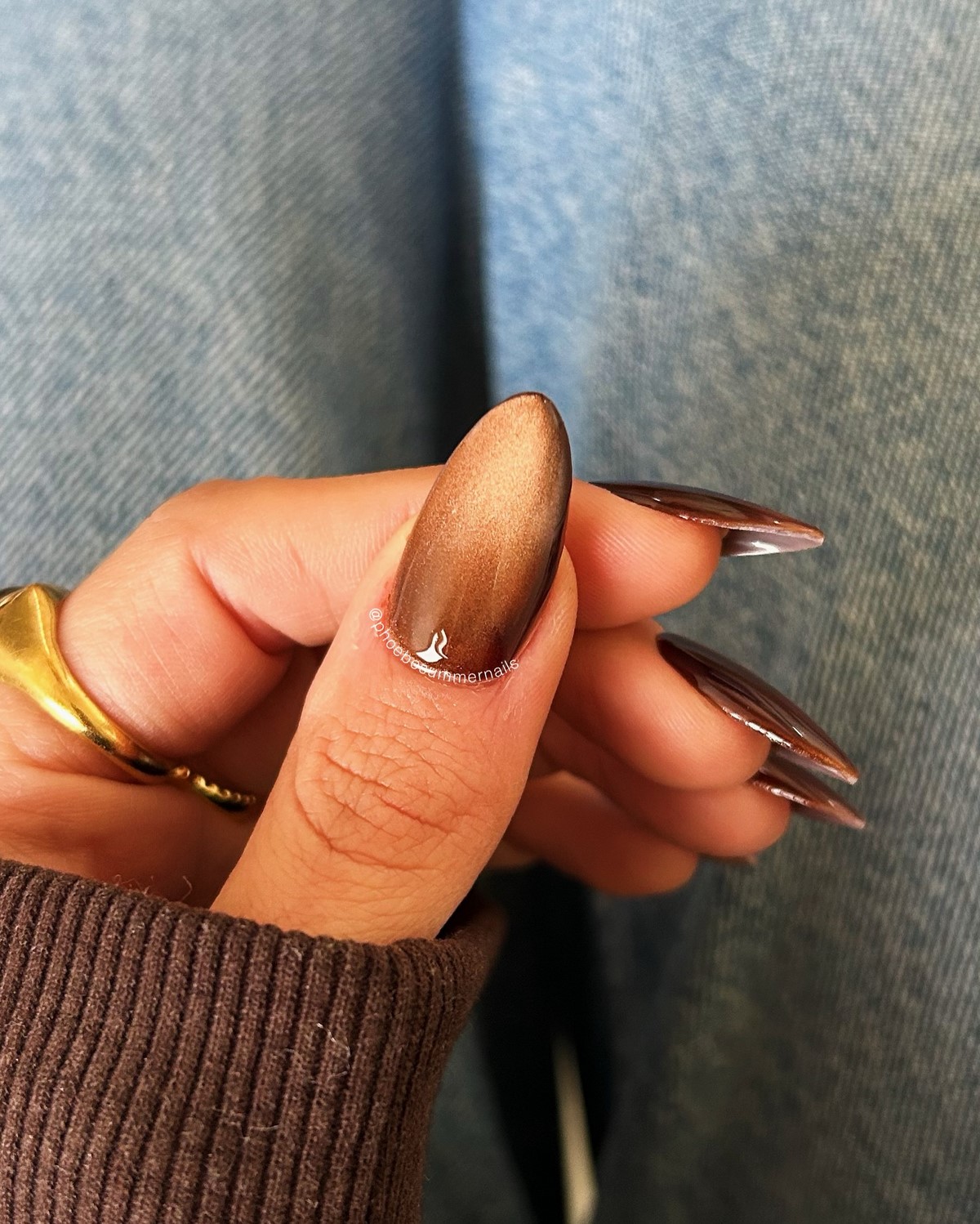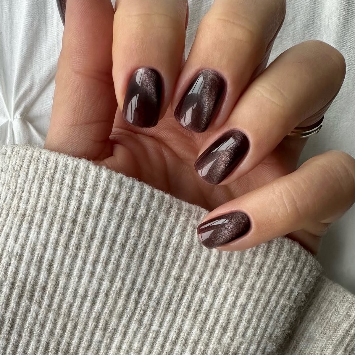 Шоколадные оттенки с магнитным эффектом визуально делают ногти более ухоженными и плотными, даже если дизайн выполнен в один слой без декора.