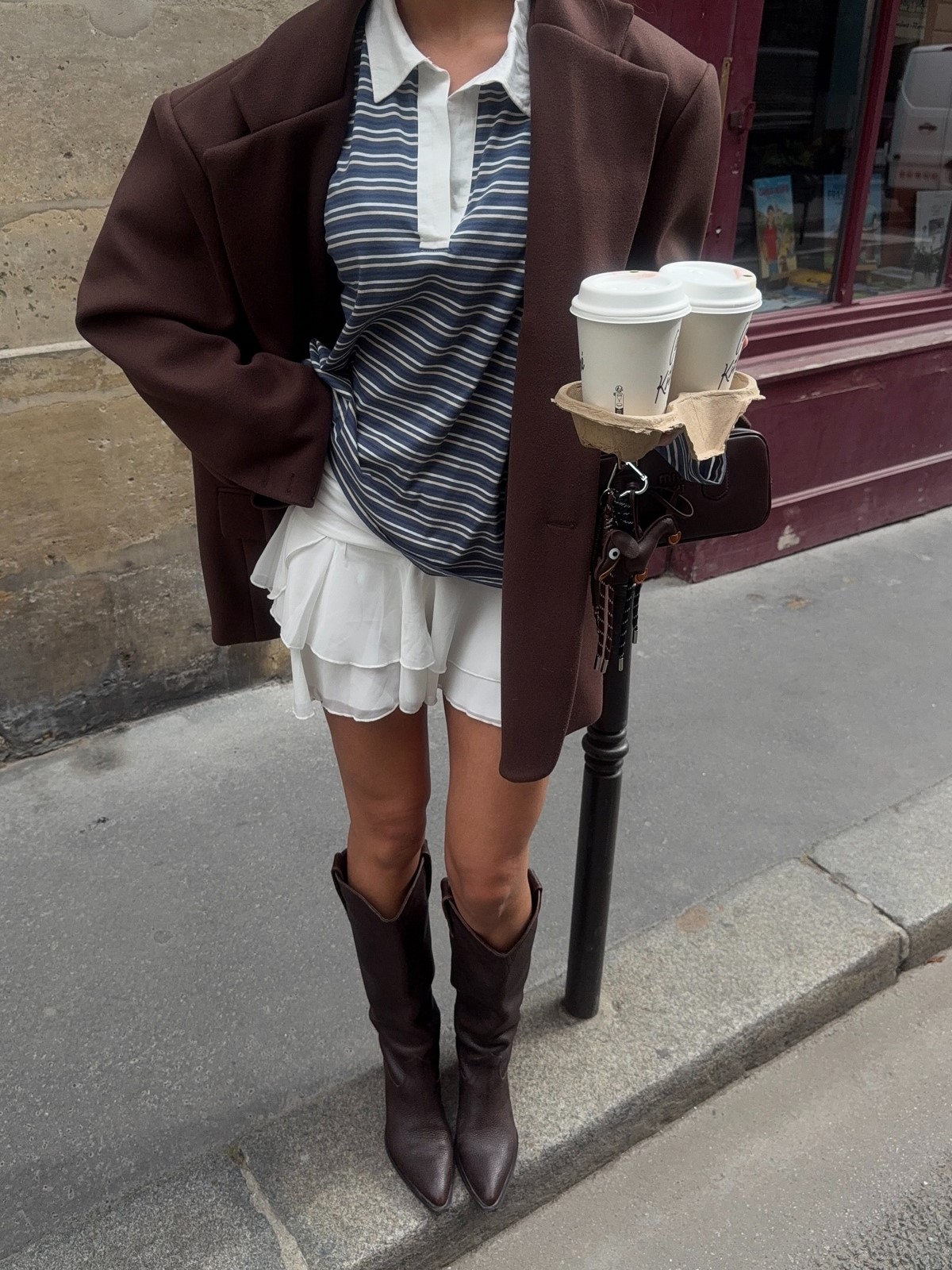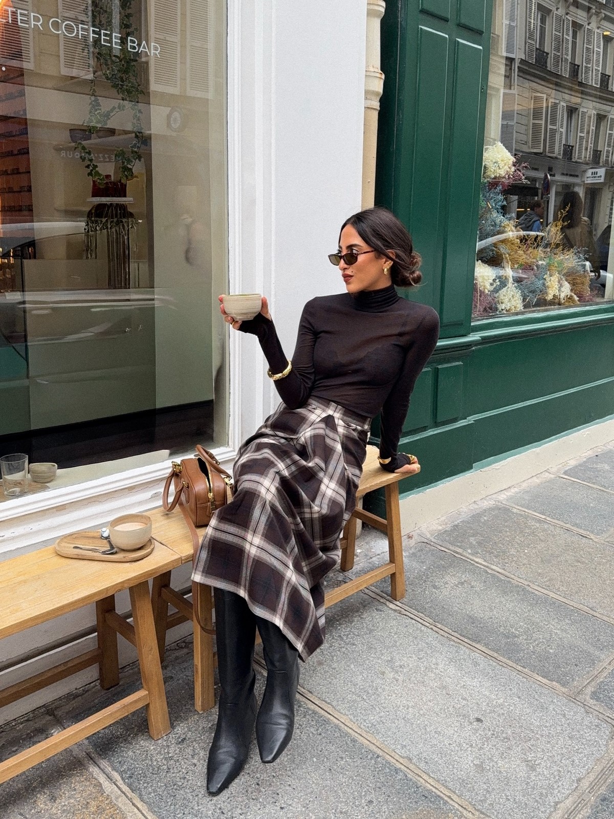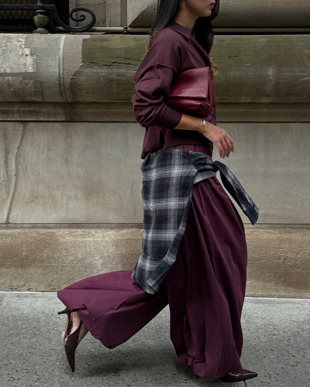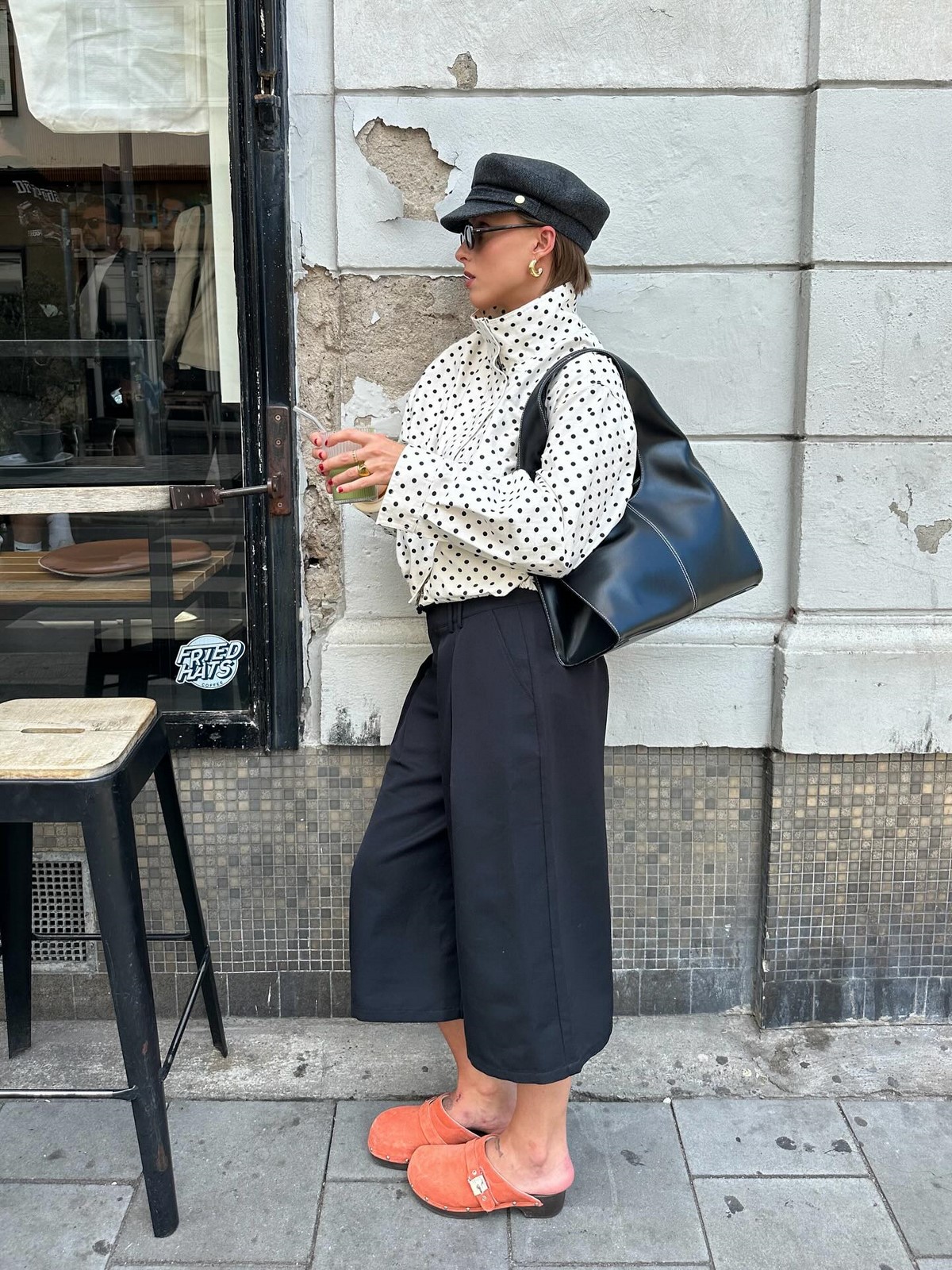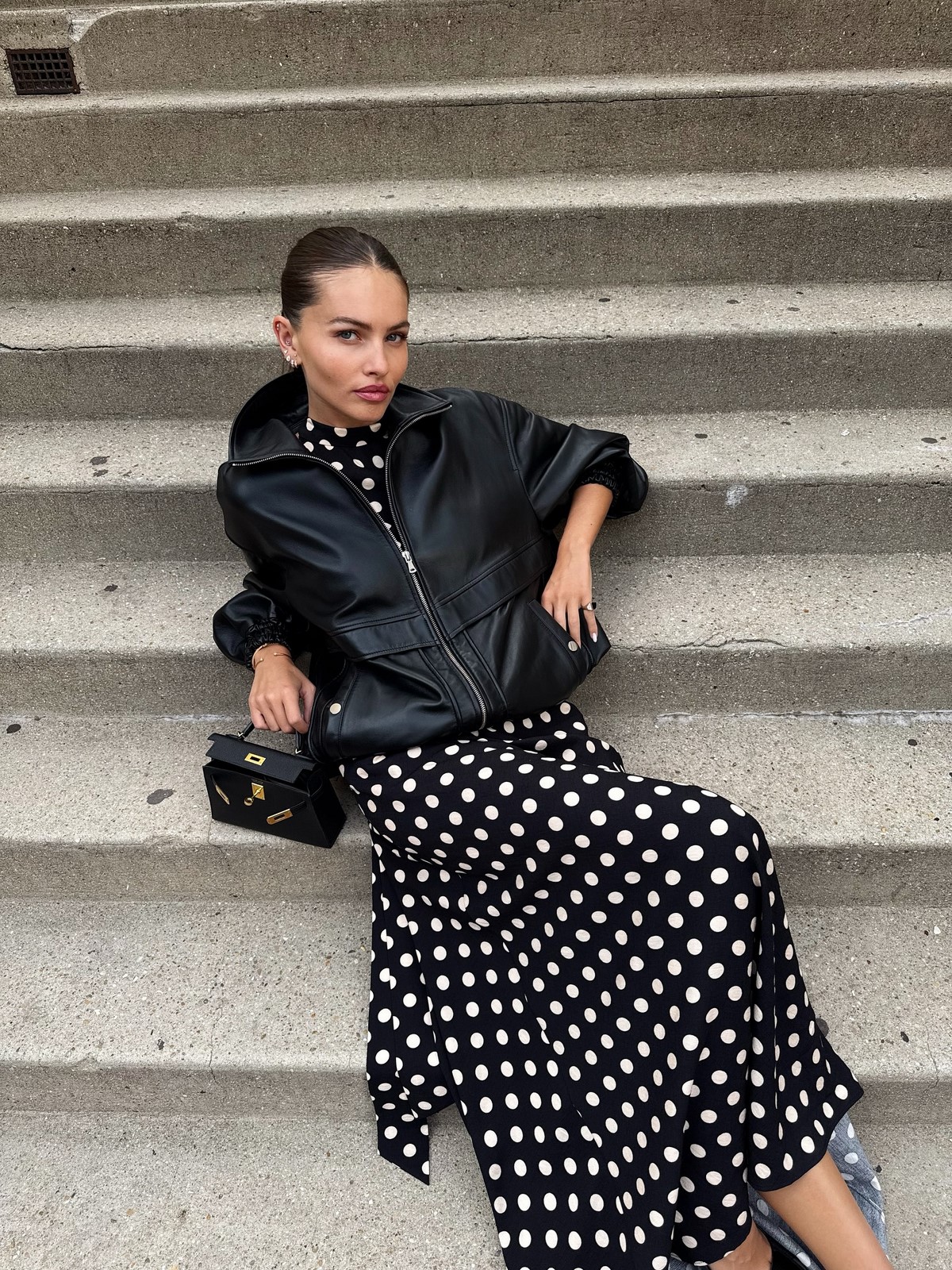 Ретро-принт в горох получил новую интерпретацию — теперь он появляется не только на платьях, но и на блузах, брюках и аксессуарах. В сезоне осень-зима 2025-2026 дизайнеры делают ставку на крупный и контрастный горох, который сразу привлекает внимание. Его часто комбинируют с кожей или строгими силуэтами, чтобы добавить образу динамики.
