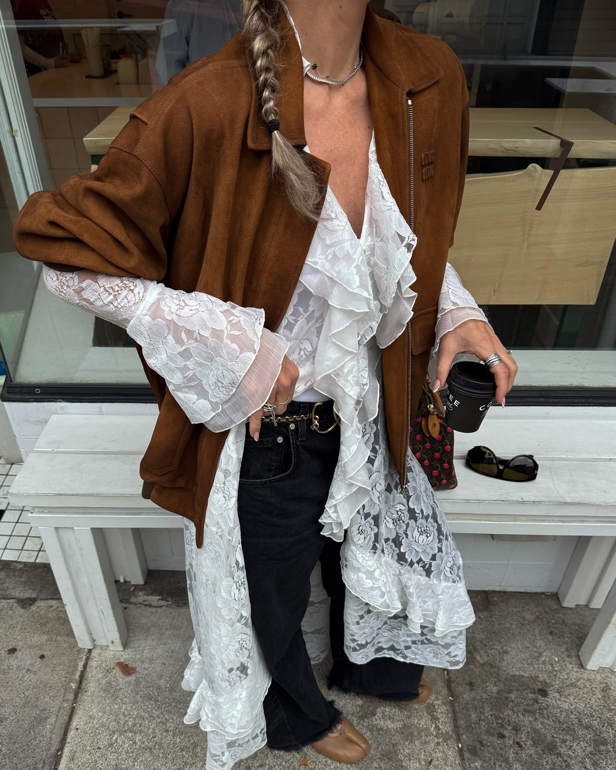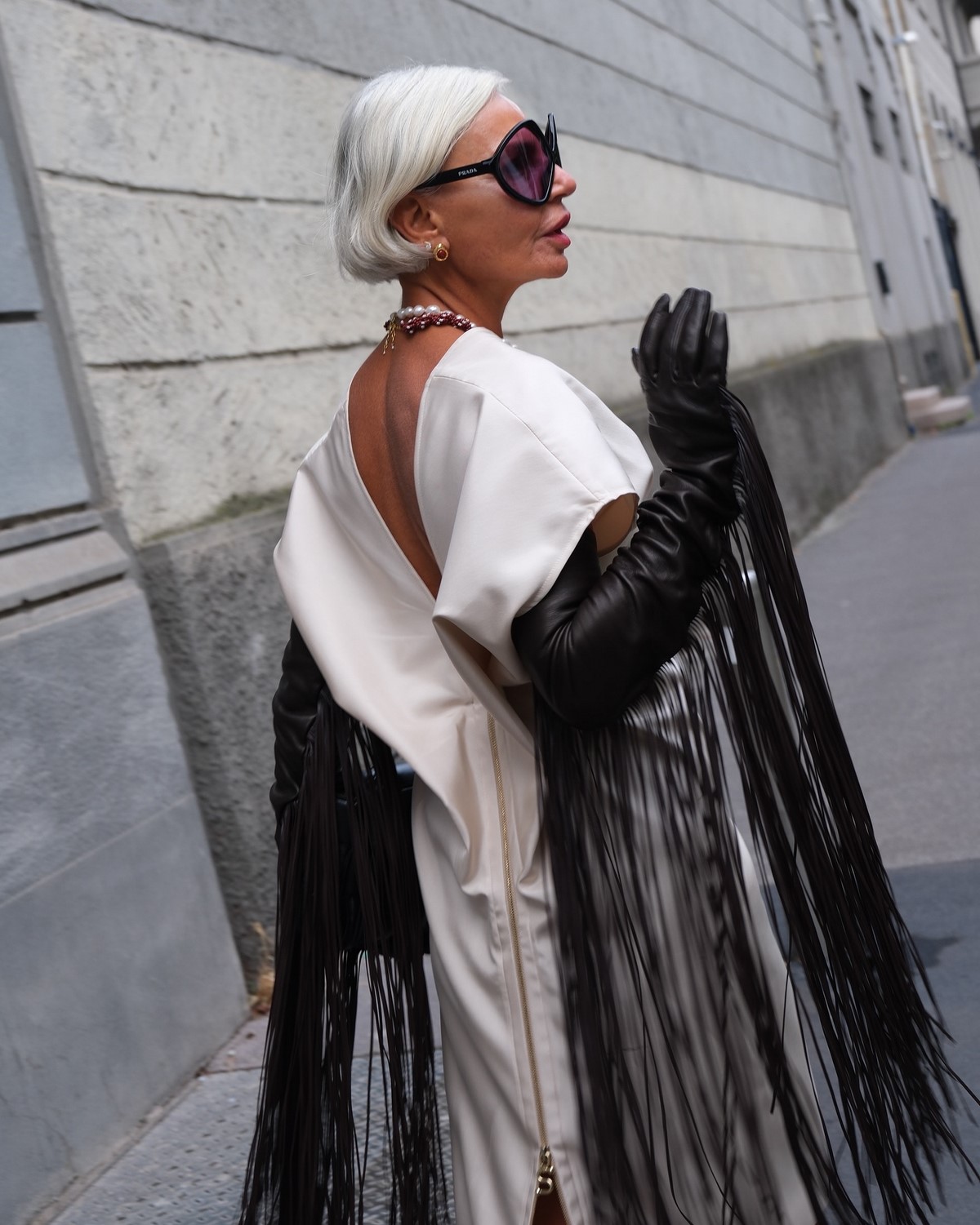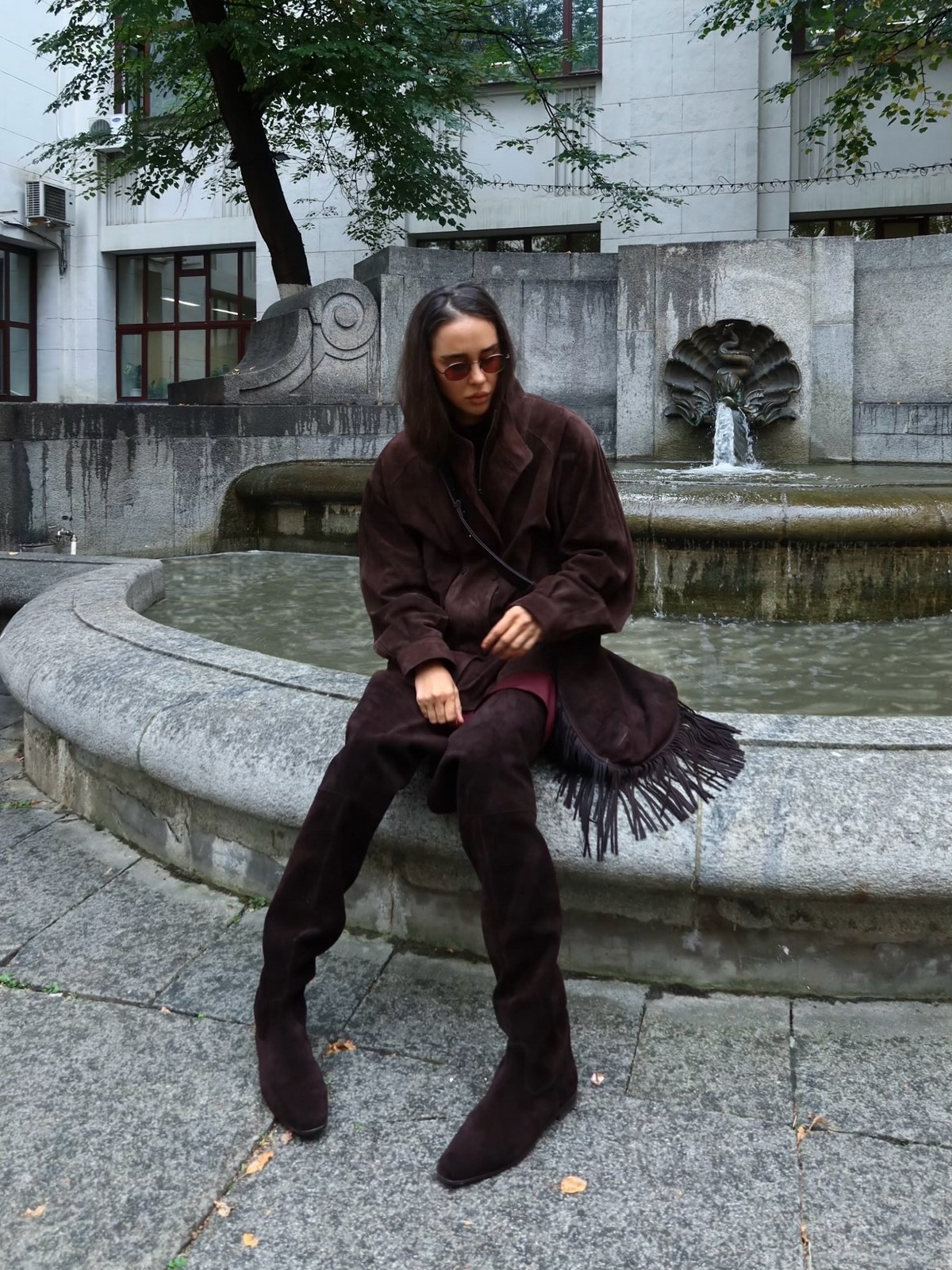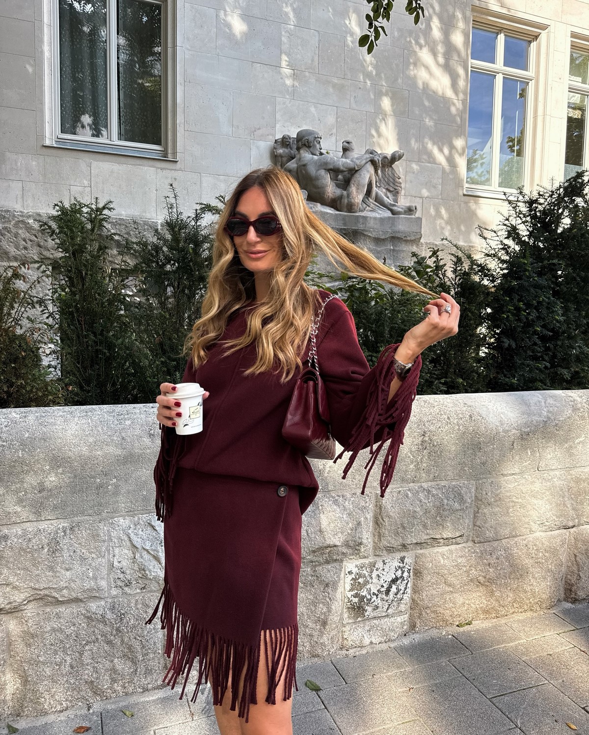 Бахрома продолжает захватывать модный подиум, становясь символом движения и динамики. В сезоне 2025-2026 она украшает юбки, платья, пальто и даже аксессуары. Длинная и многослойная бахрома делает образ игривым и выразительным, особенно в сочетании с гладкими тканями.
