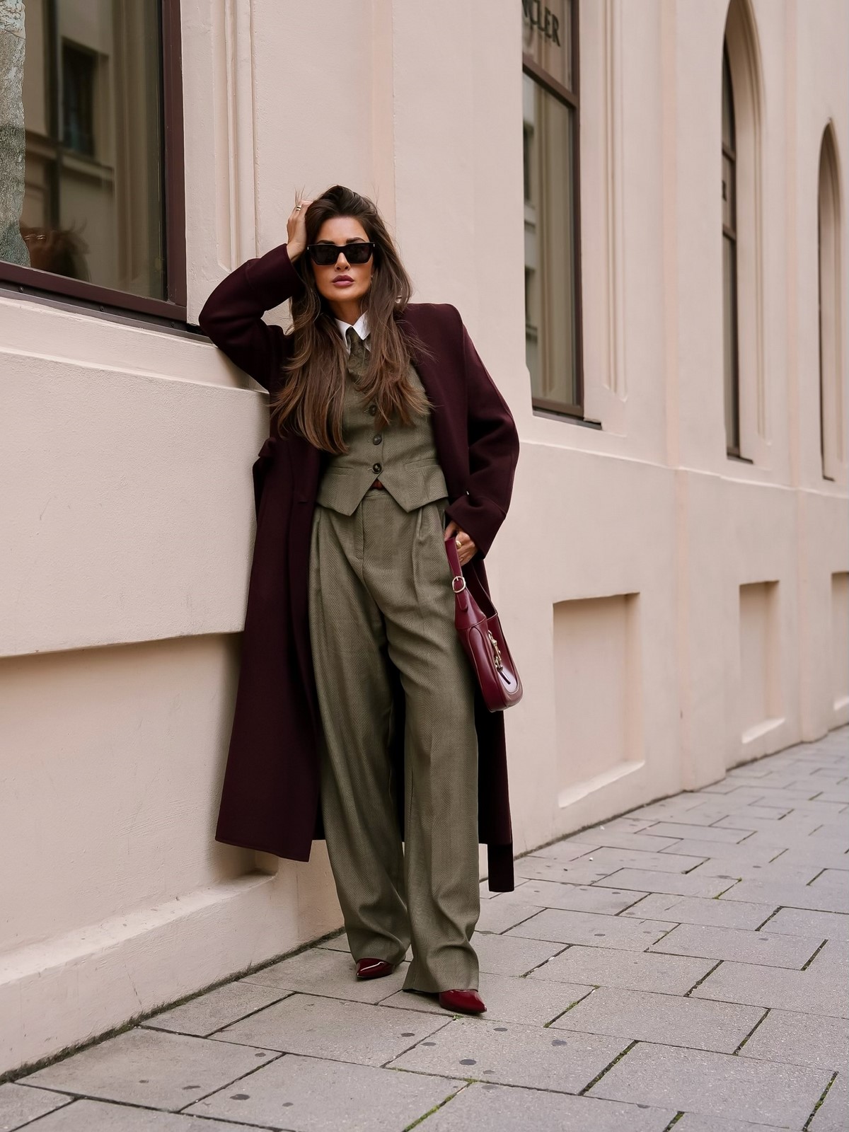 - Цвета: на пике — насыщенный красный, глубокий зеленый, винный, оттенки металлик, а также спокойные нюдовые и серые тона.