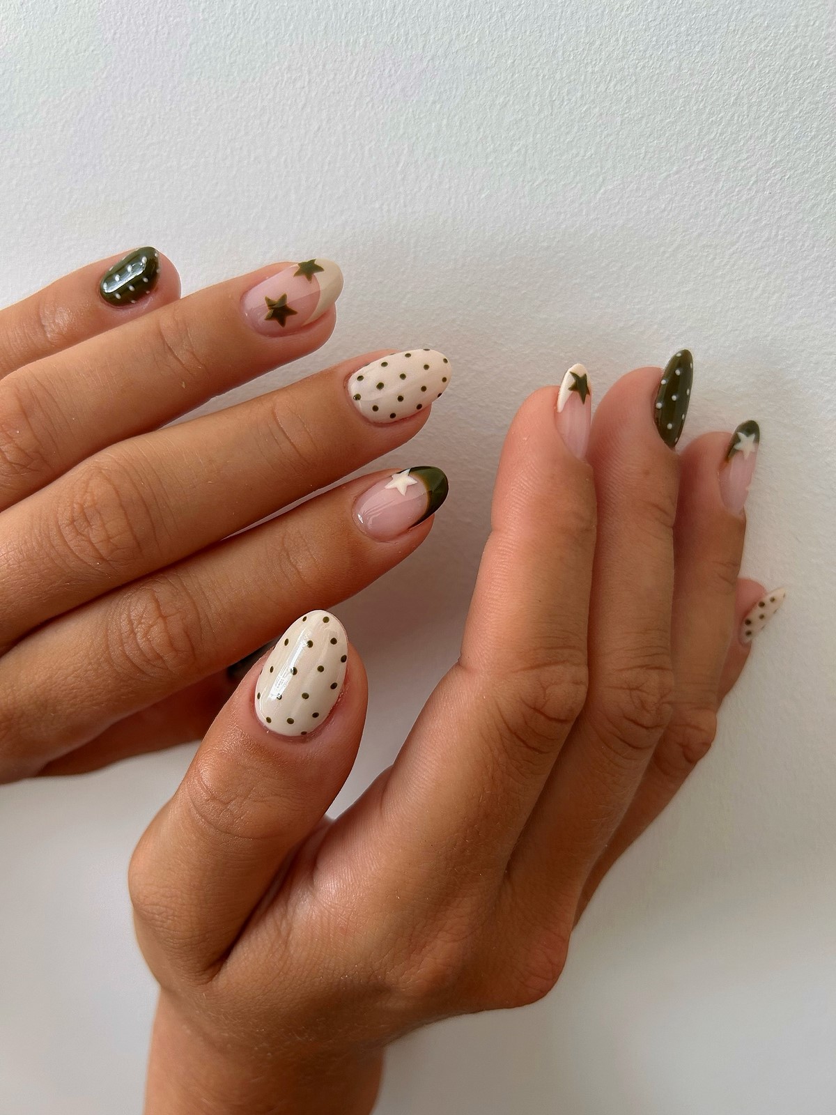 Золотые звезды — воплощение зимнего тепла и роскоши. Они напоминают праздничное сияние свечей и идеально смотрятся на бордовых, шоколадных, зеленых и черных базах. Такой маникюр легче адаптировать под вечерний образ или новогоднюю вечеринку.