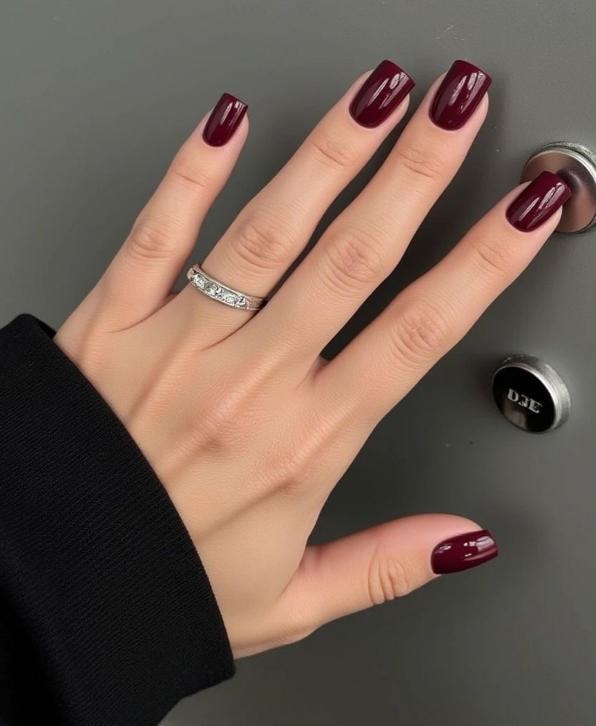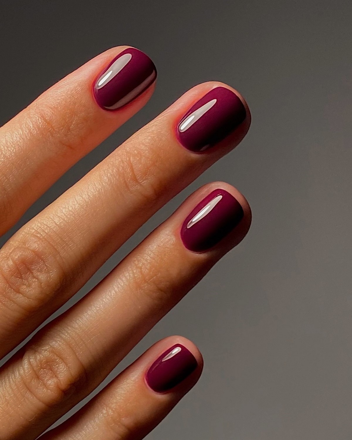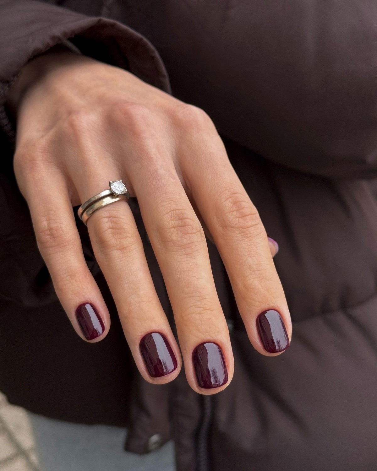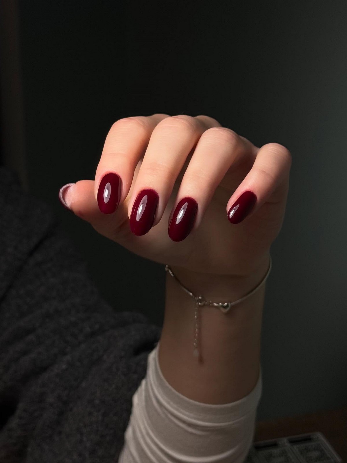 Бордовый — воплощение страсти и уверенности. Этот оттенок подходит для любых форм ногтей и идеально подчеркивает осенний гардероб. В ноябре 2025 он становится ключевым акцентом вечерних луков и отлично смотрится в глянцевом или бархатном исполнении.