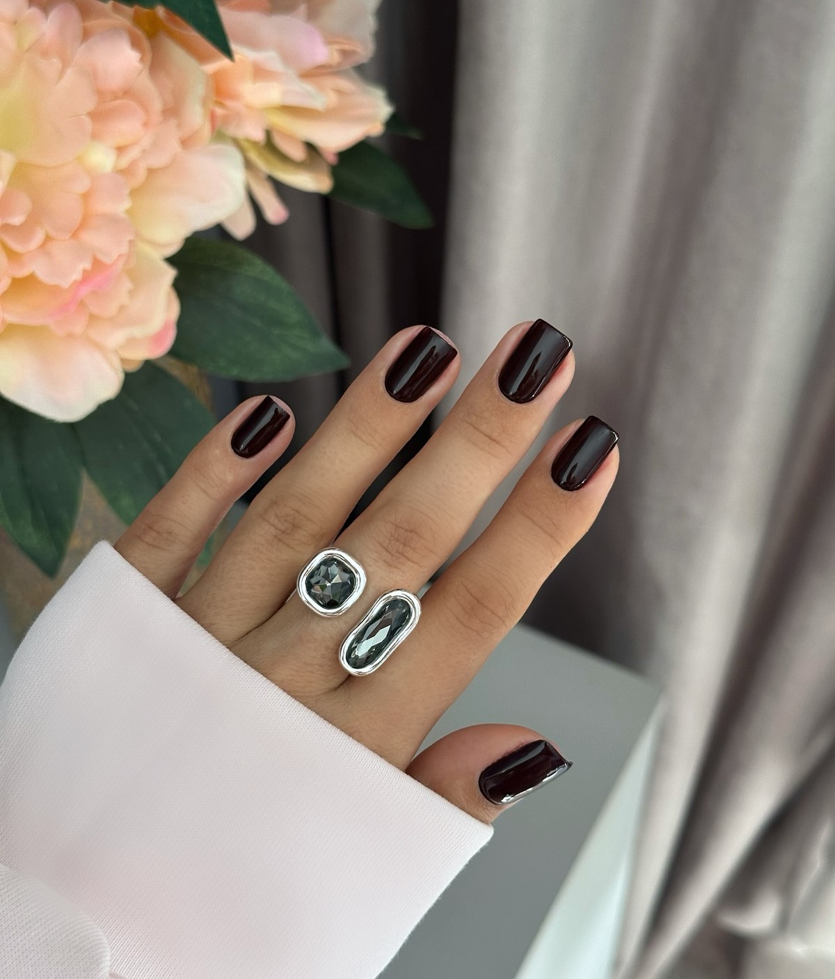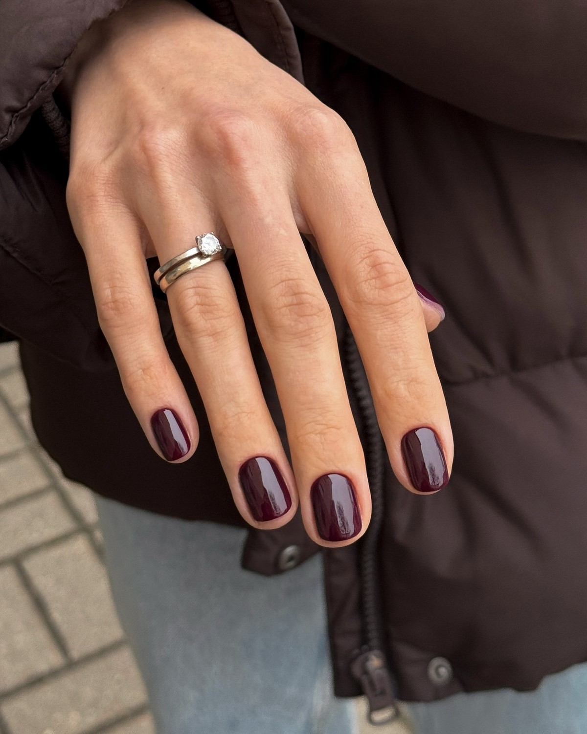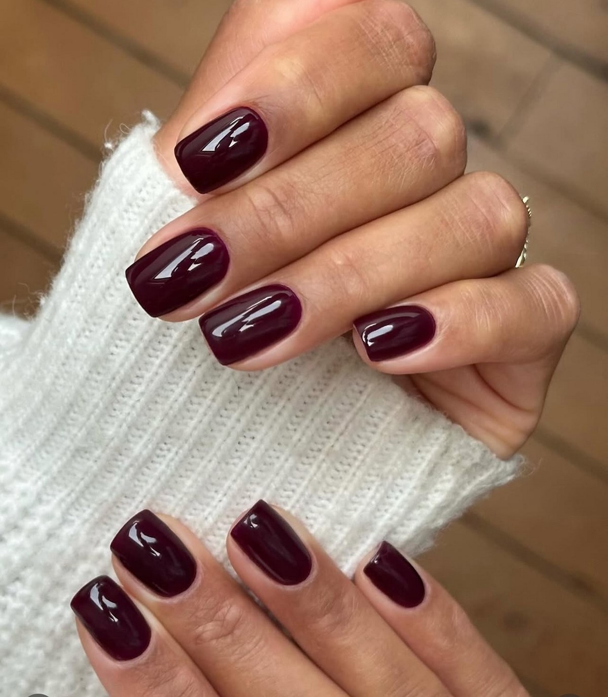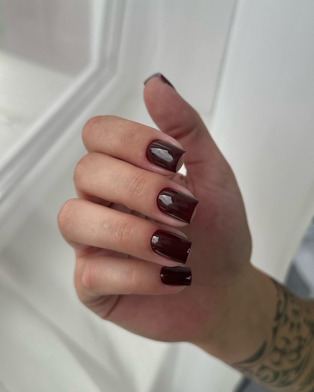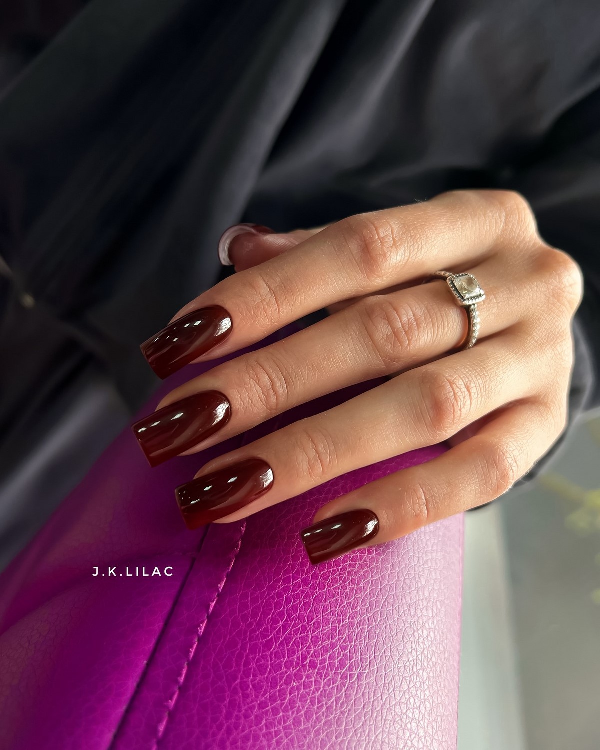 Бордовый — воплощение страсти и уверенности. Этот оттенок подходит для любых форм ногтей и идеально подчеркивает осенний гардероб. В ноябре 2025 он становится ключевым акцентом вечерних луков и отлично смотрится в глянцевом или бархатном исполнении.