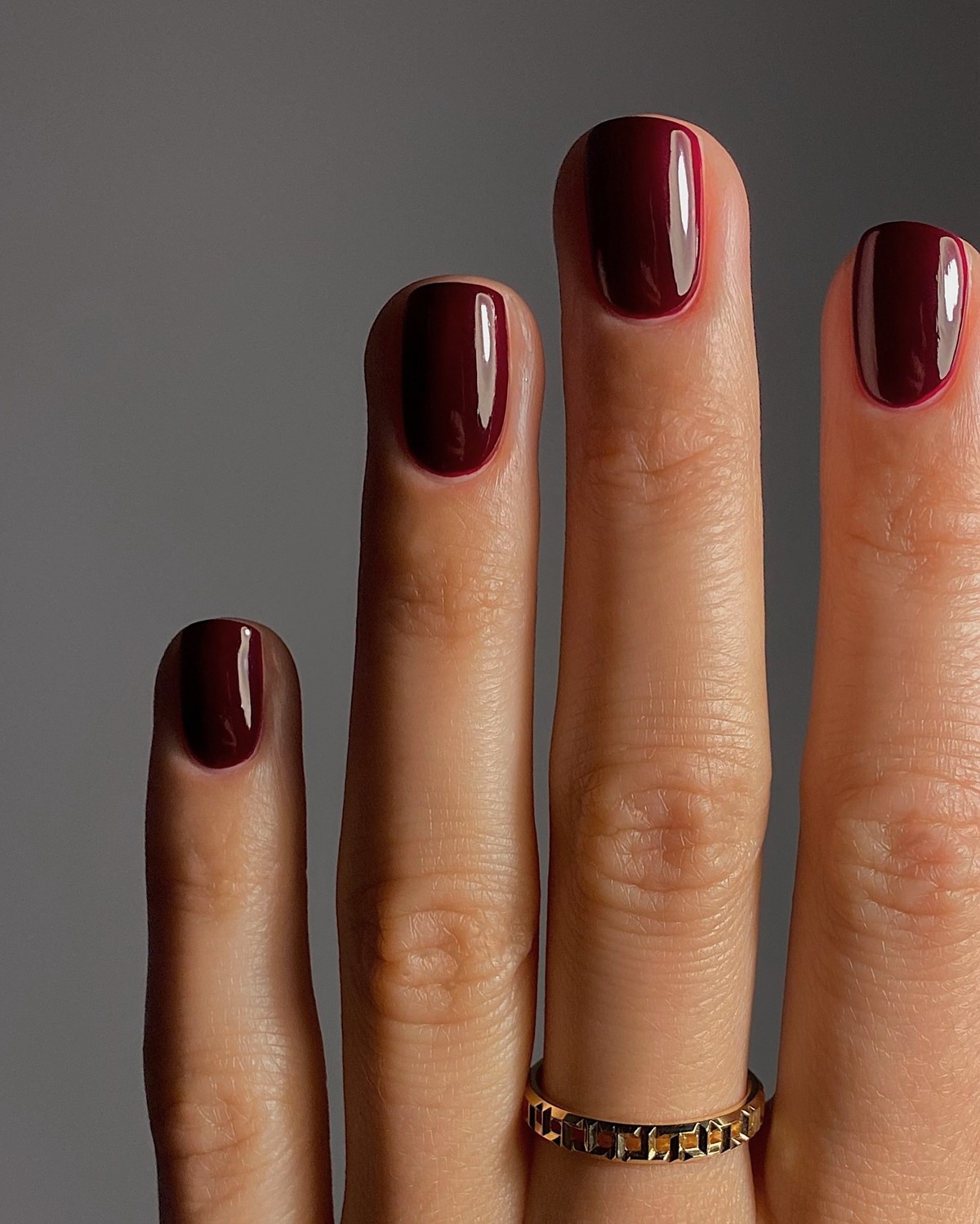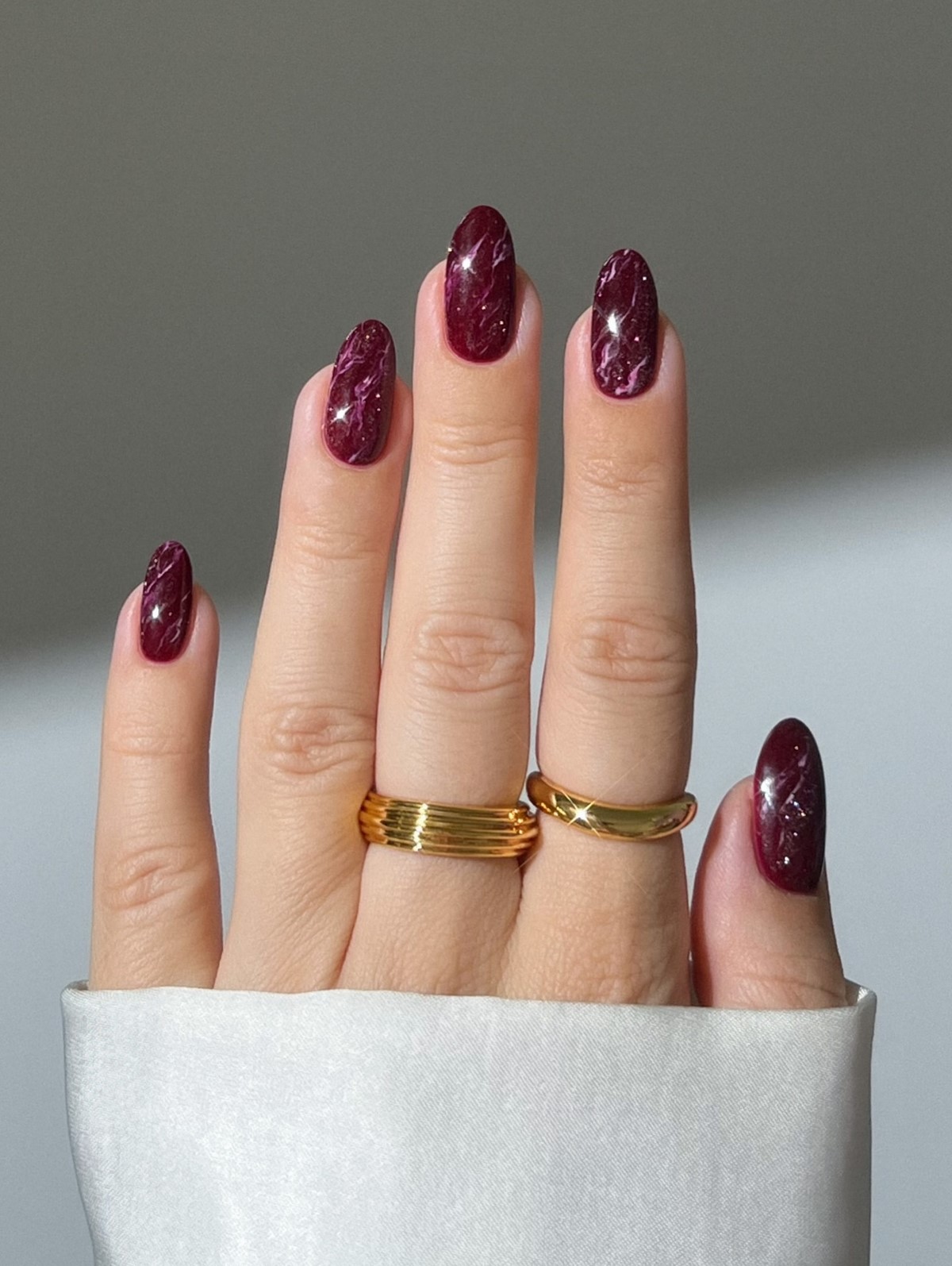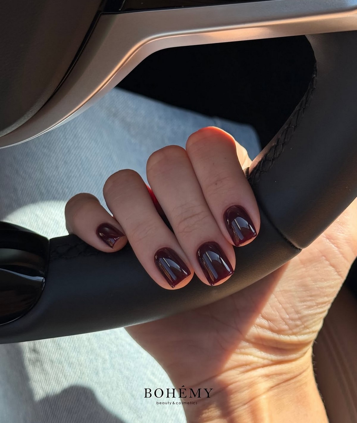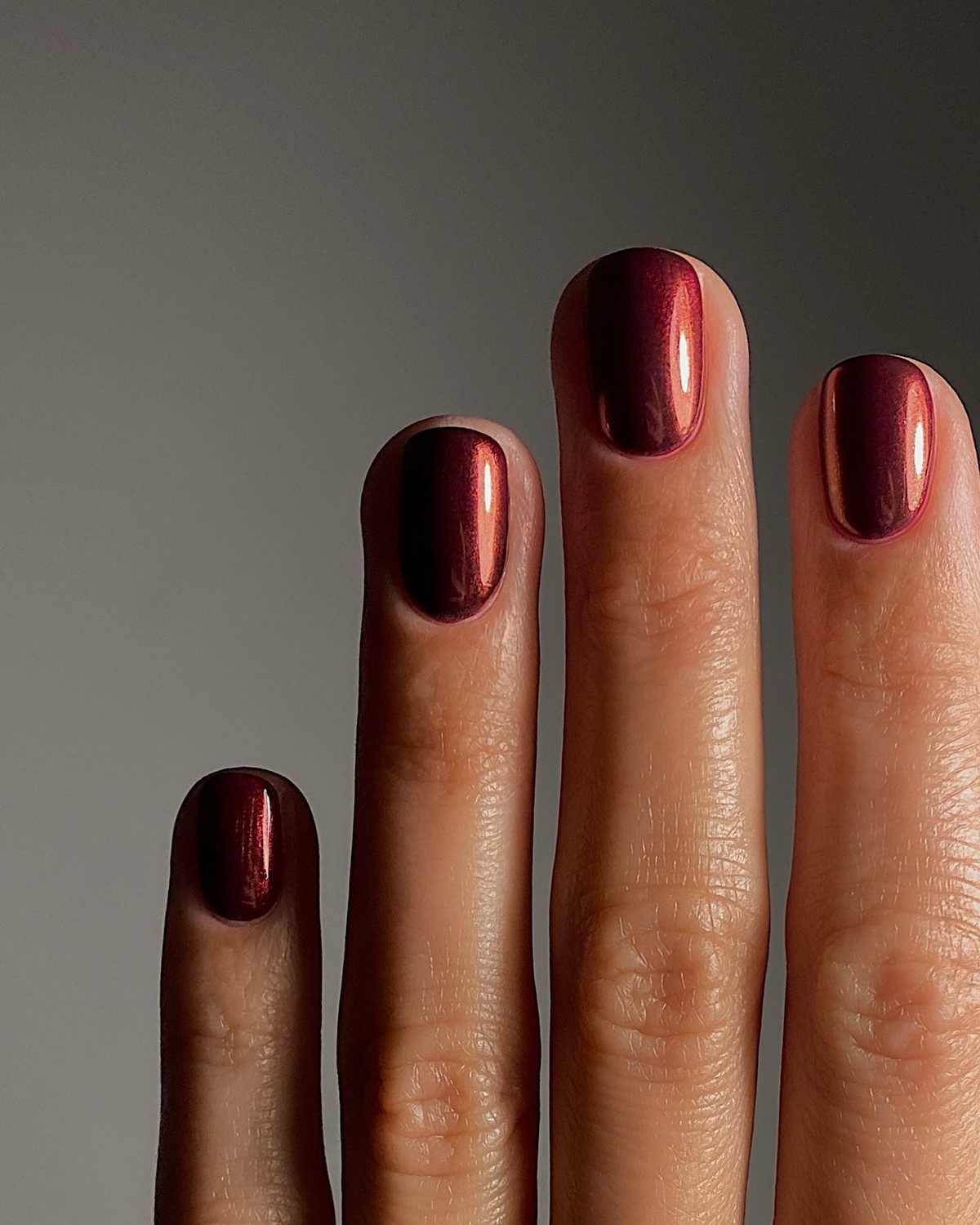 Бордовый — воплощение страсти и уверенности. Этот оттенок подходит для любых форм ногтей и идеально подчеркивает осенний гардероб. В ноябре 2025 он становится ключевым акцентом вечерних луков и отлично смотрится в глянцевом или бархатном исполнении.