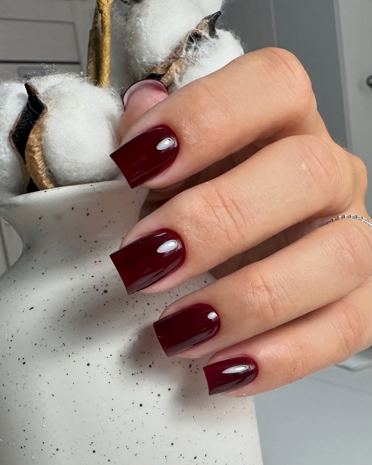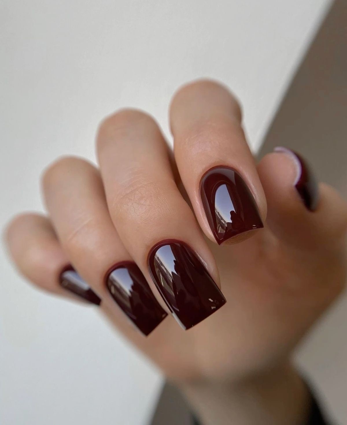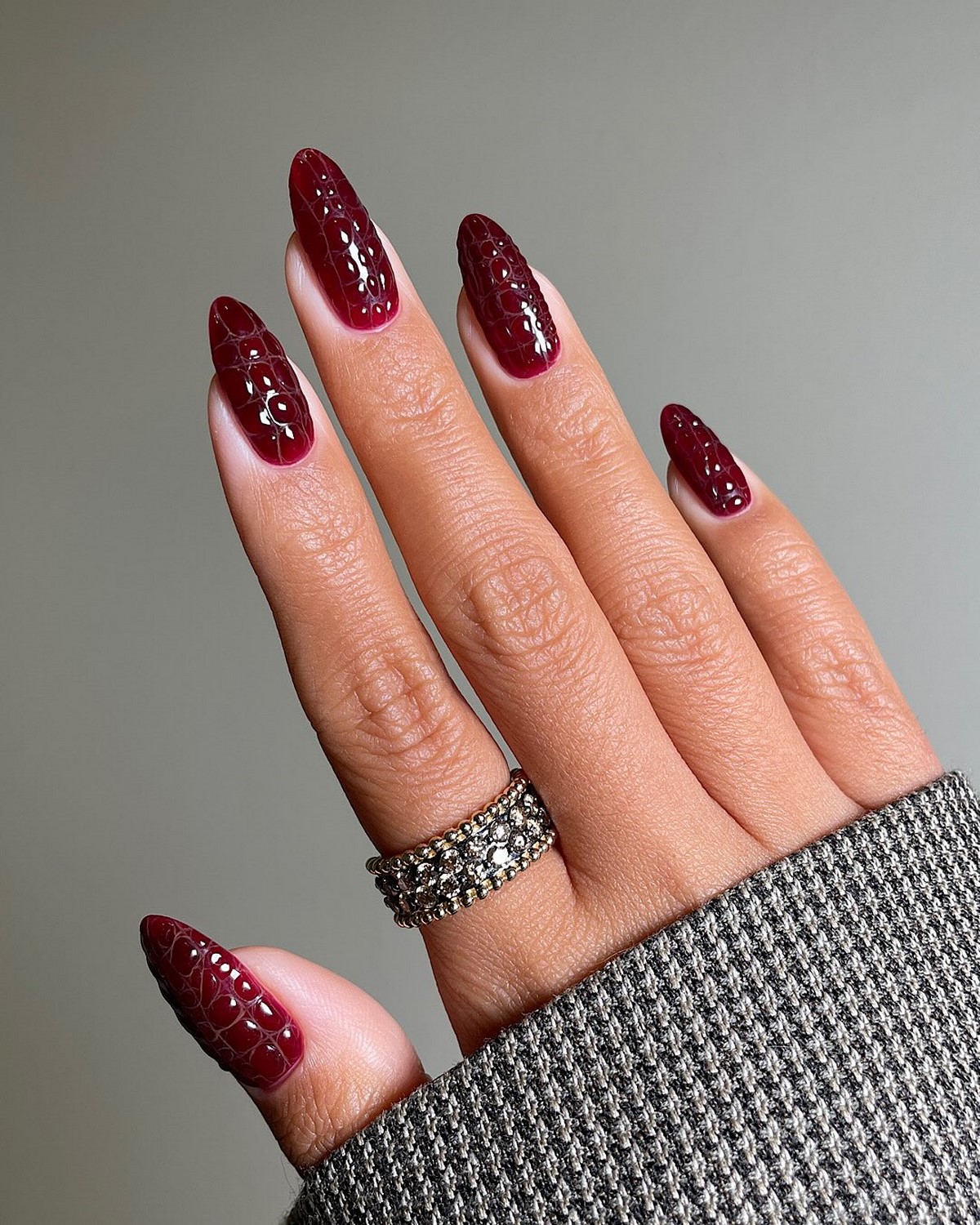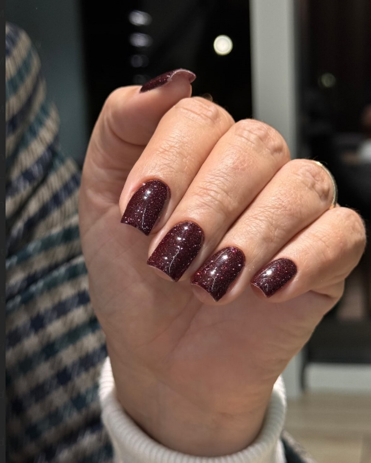 Бордовый — воплощение страсти и уверенности. Этот оттенок подходит для любых форм ногтей и идеально подчеркивает осенний гардероб. В ноябре 2025 он становится ключевым акцентом вечерних луков и отлично смотрится в глянцевом или бархатном исполнении.
