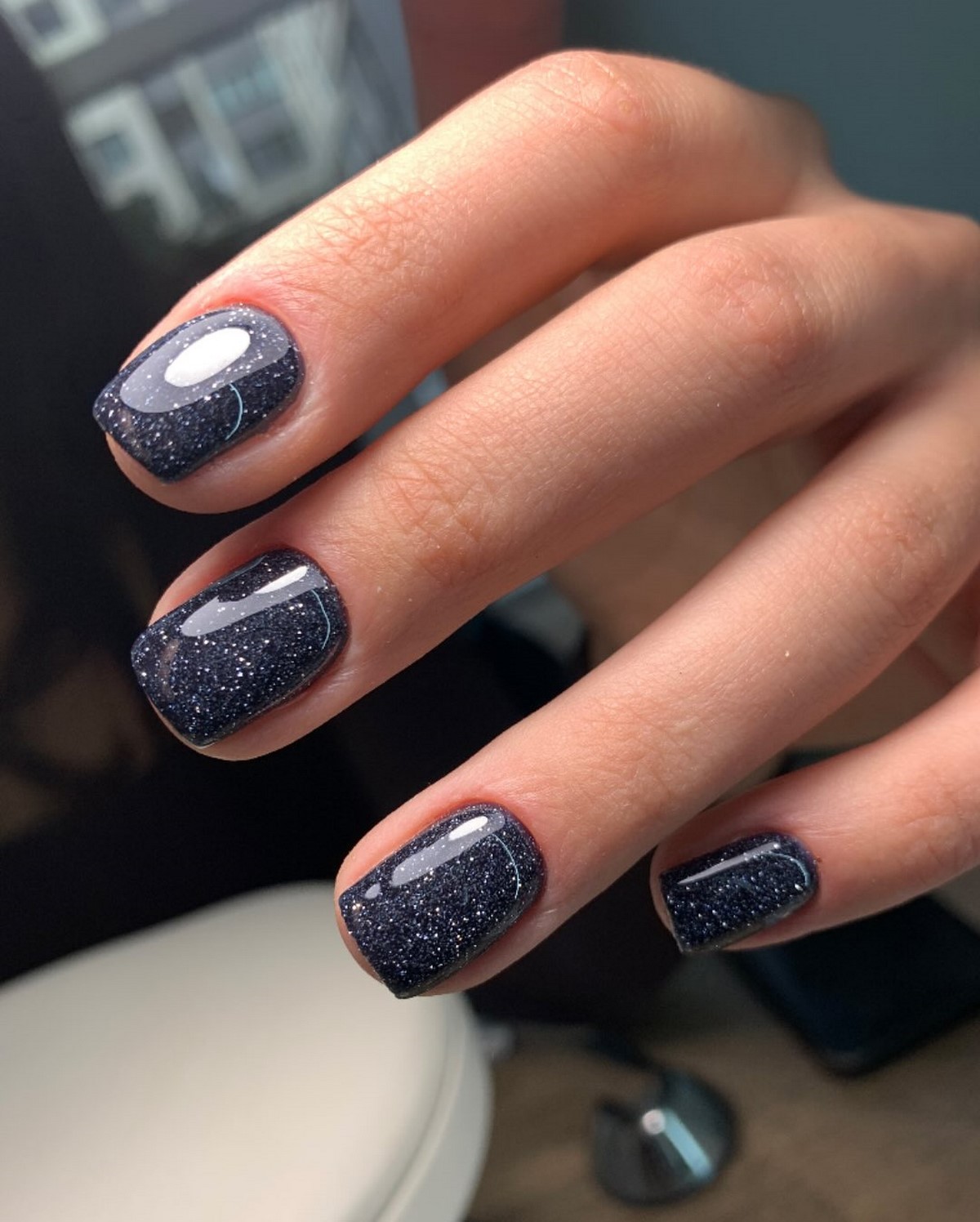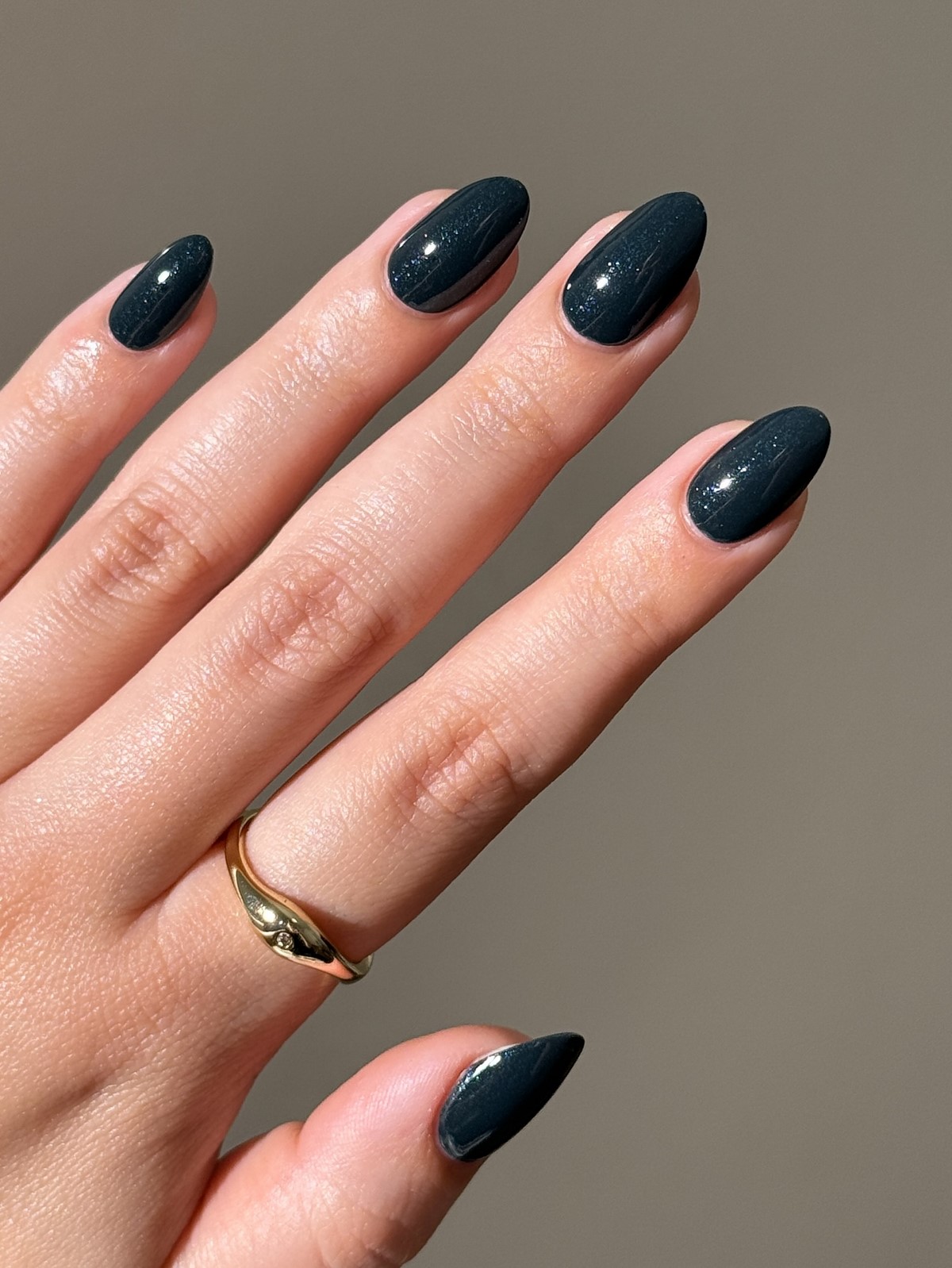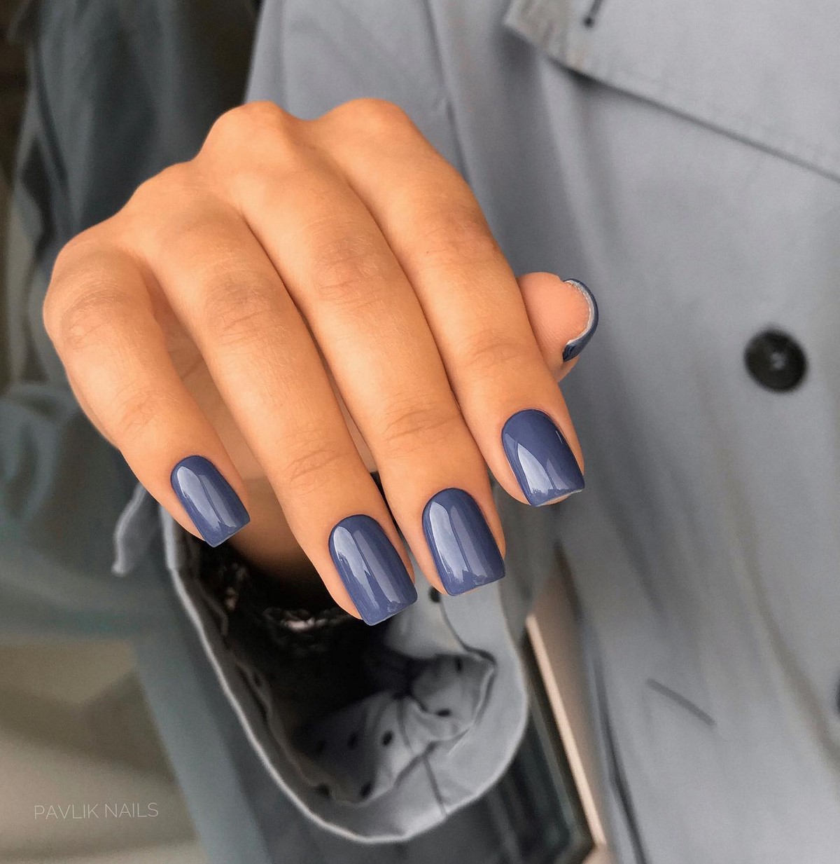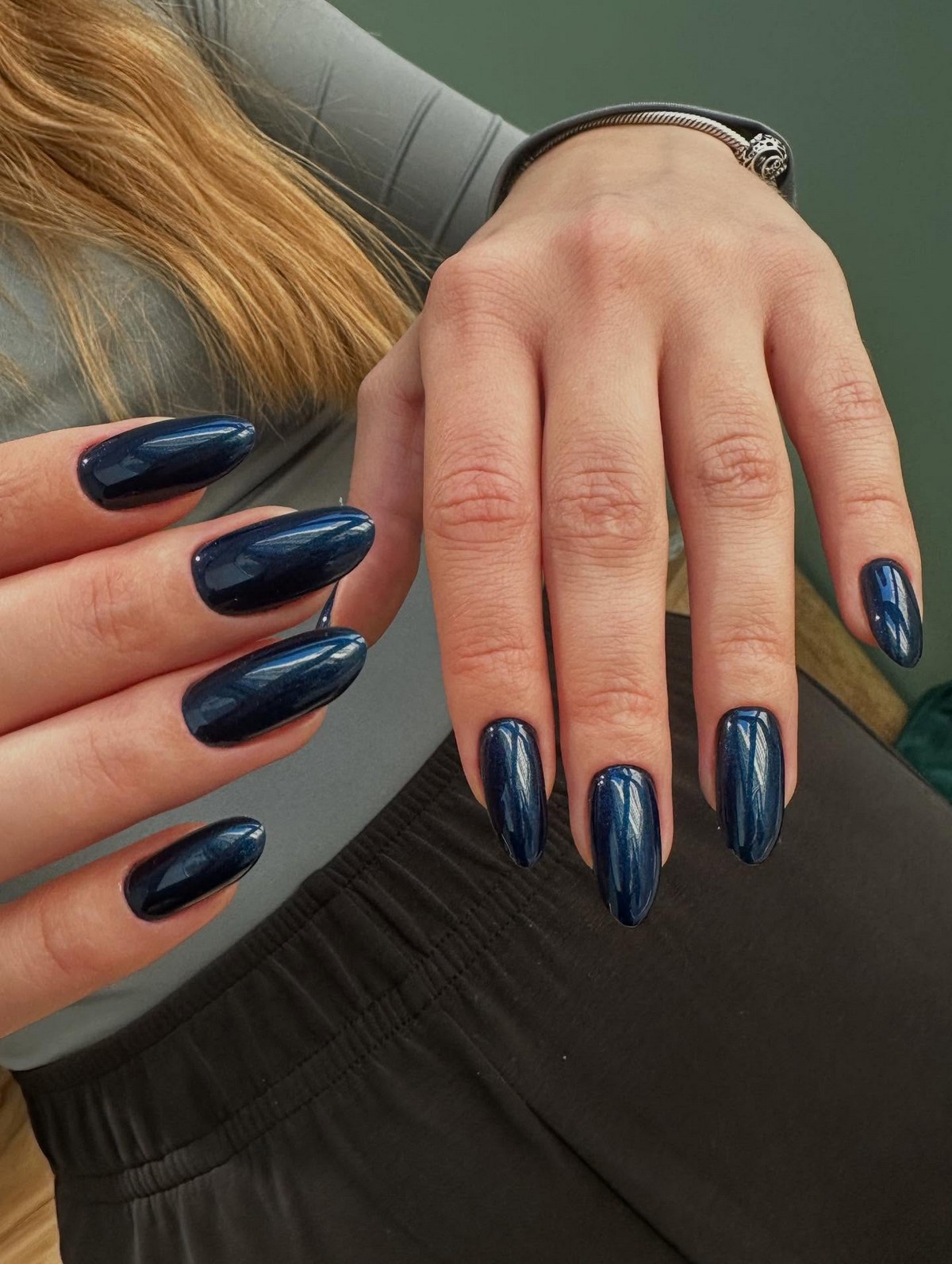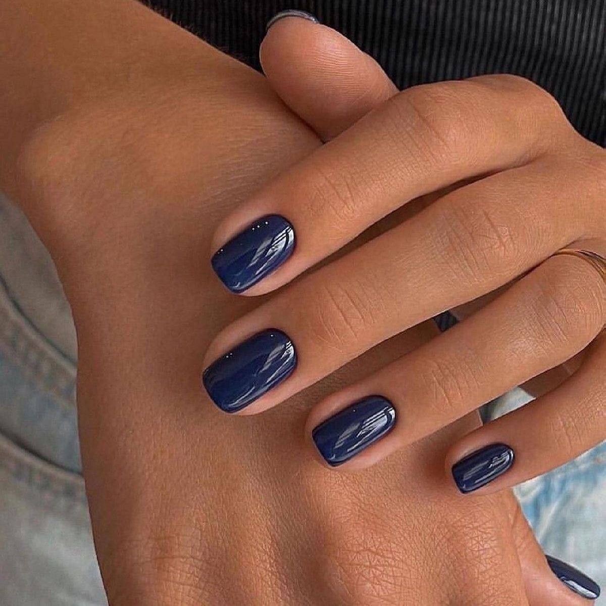 Темно-синий — альтернатива черному, но более мягкая и универсальная. Этот цвет добавляет глубину и делает руки утонченными. Идеален для маникюра в стиле minimal chic, особенно в матовом или сатиновом финише.