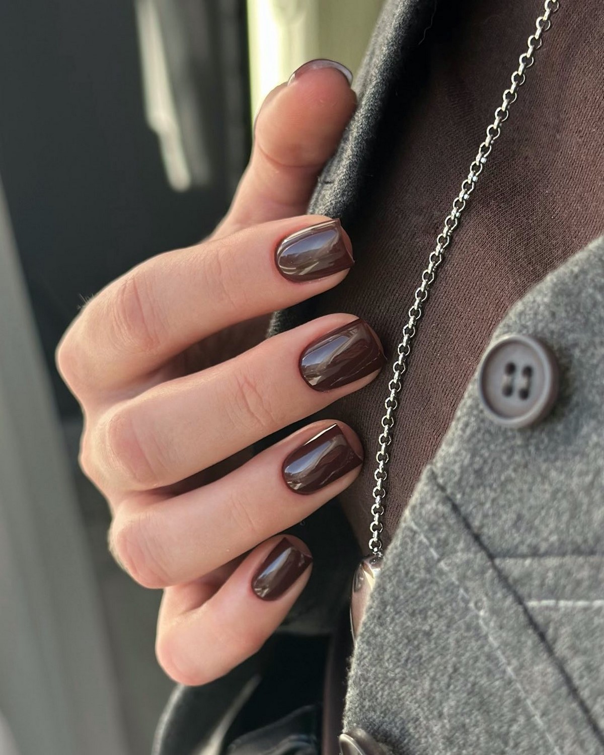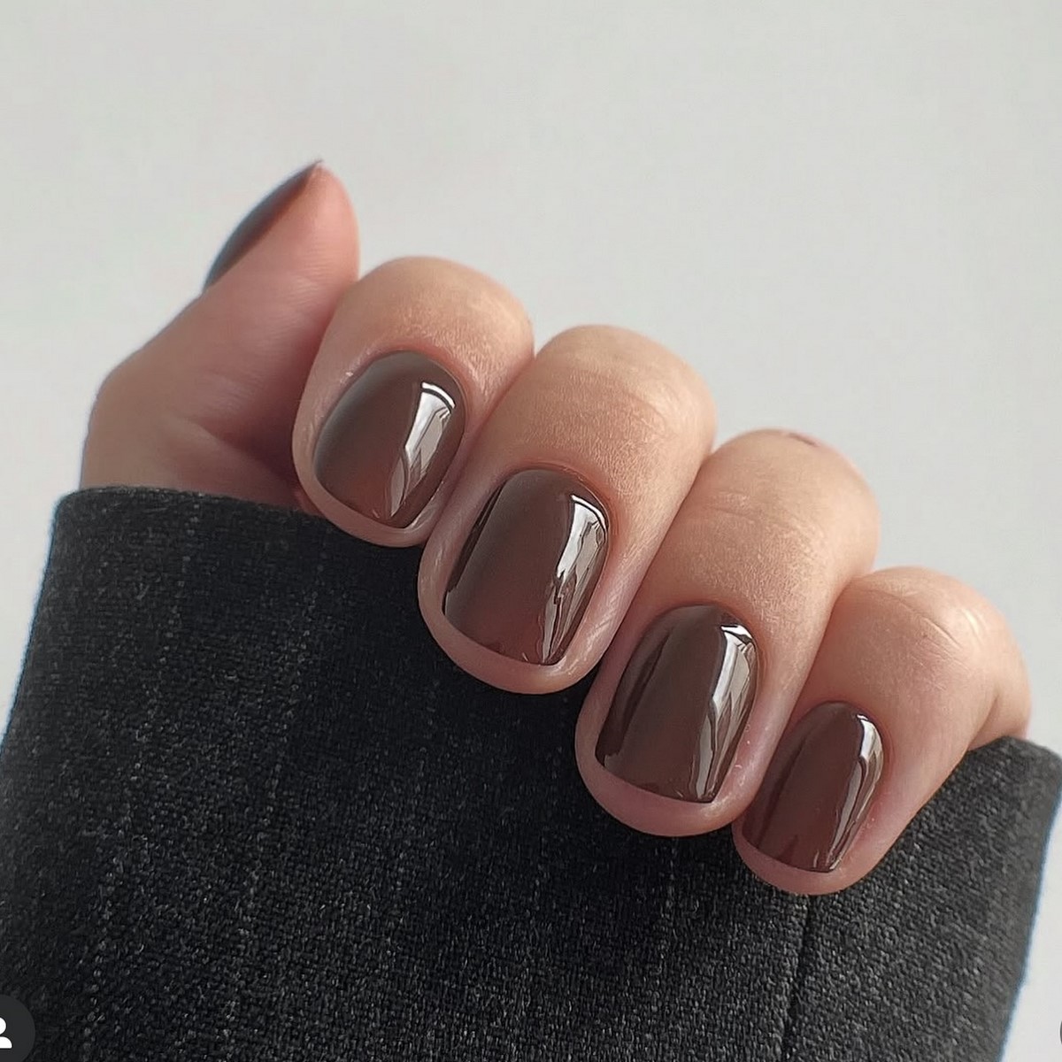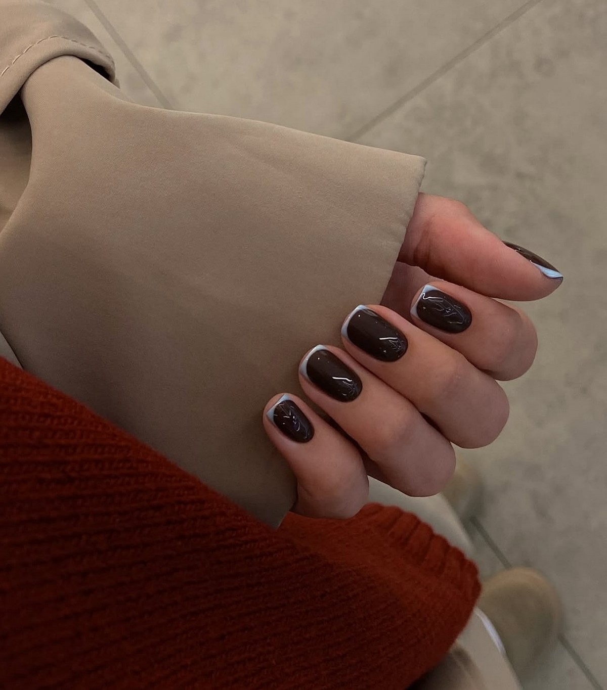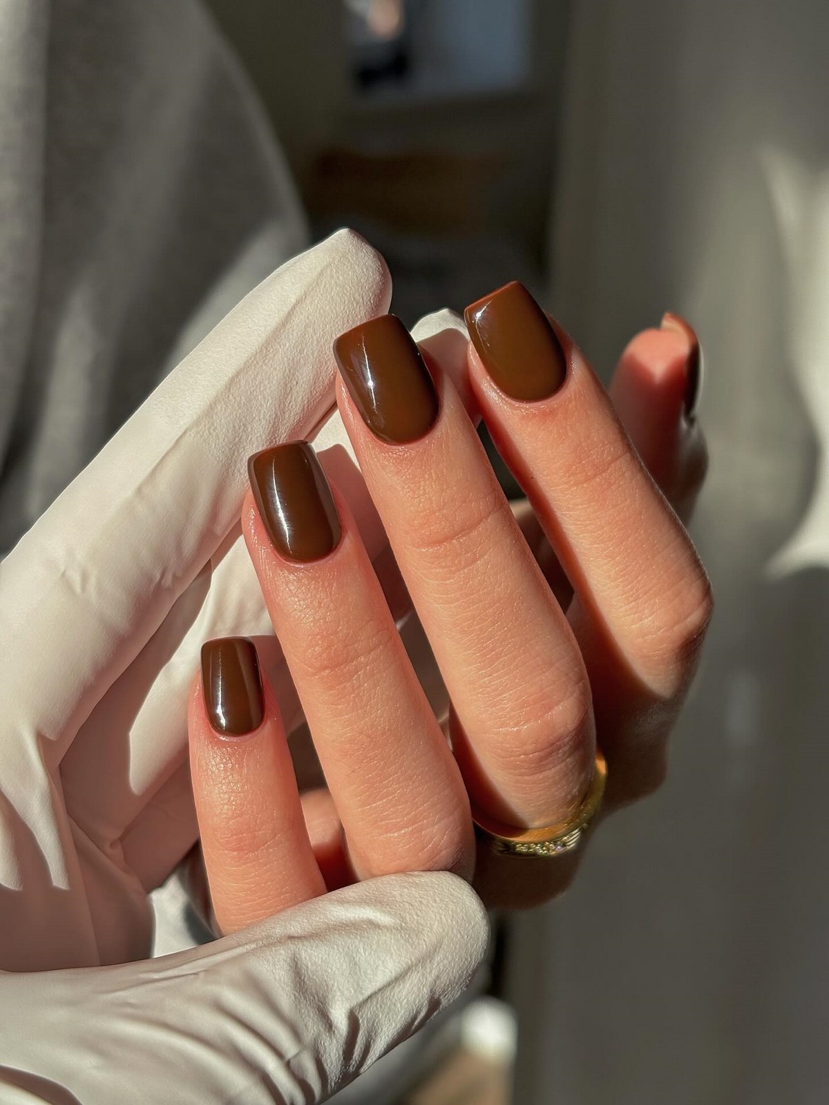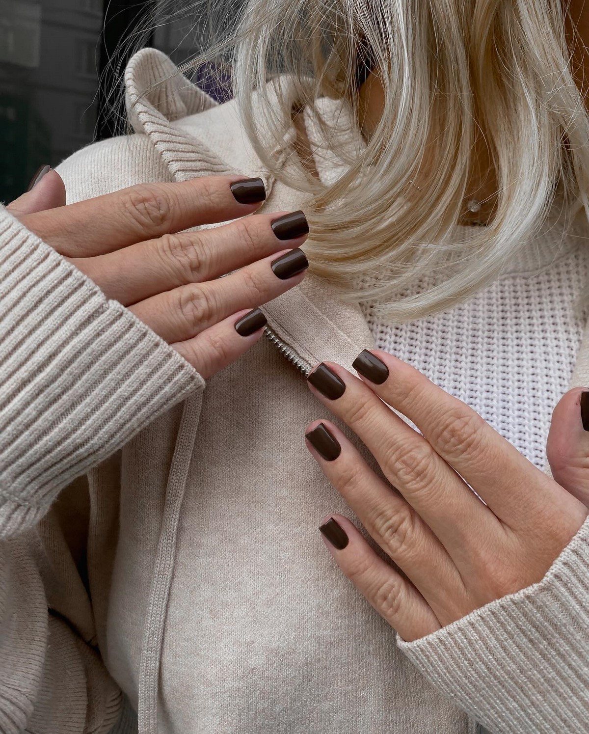 Шоколадный маникюр идеально передает настроение поздней осени. Он согревает образ, делая его уютным и утонченным. Особенно красиво смотрится в сочетании с молочным или бронзовым декором, создавая эффект мягкого контраста.