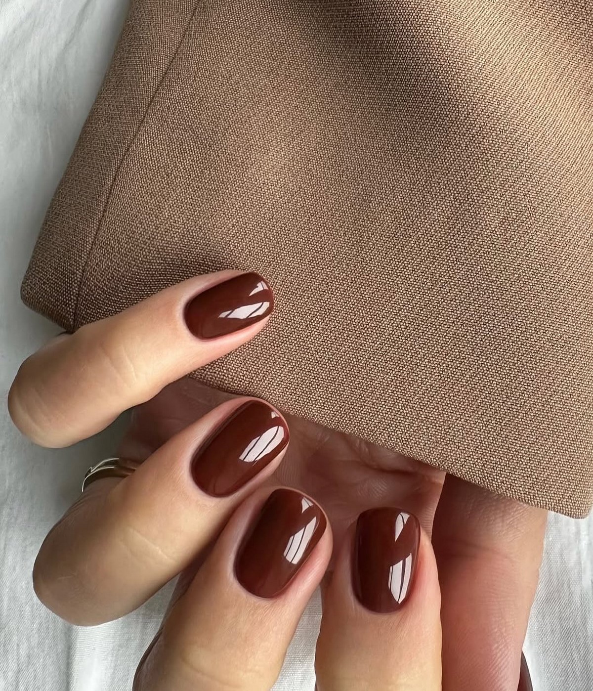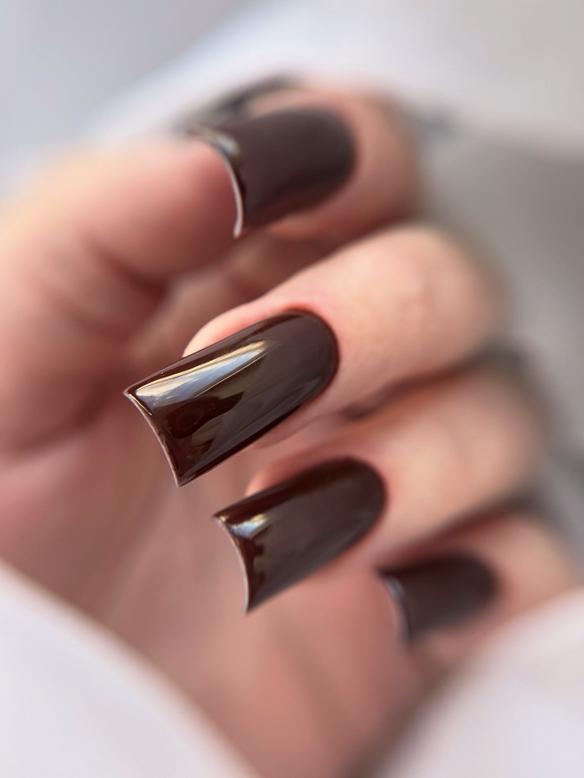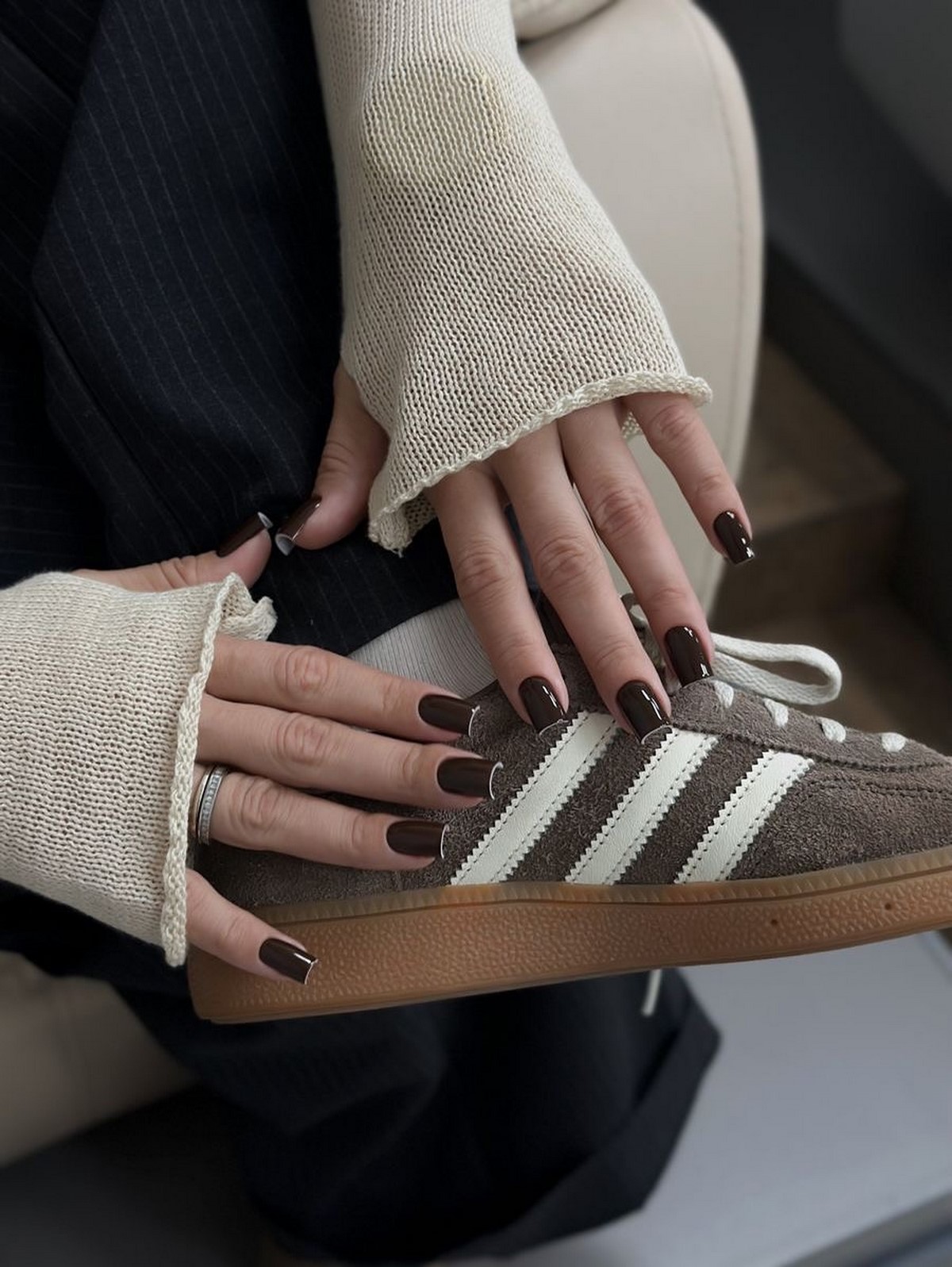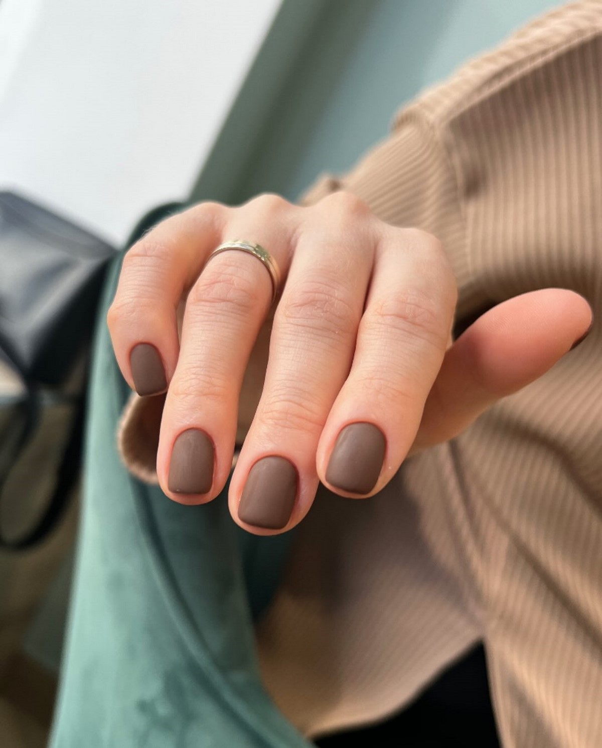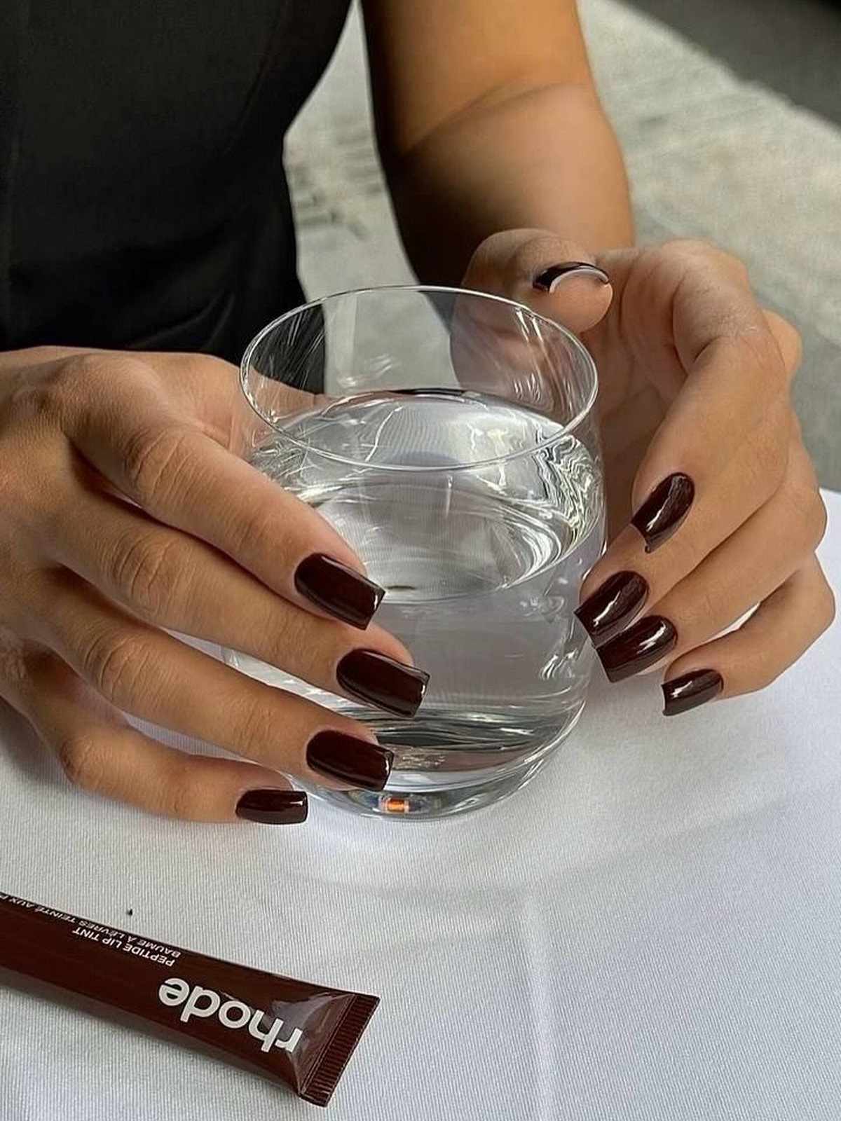 Шоколадный маникюр идеально передает настроение поздней осени. Он согревает образ, делая его уютным и утонченным. Особенно красиво смотрится в сочетании с молочным или бронзовым декором, создавая эффект мягкого контраста.