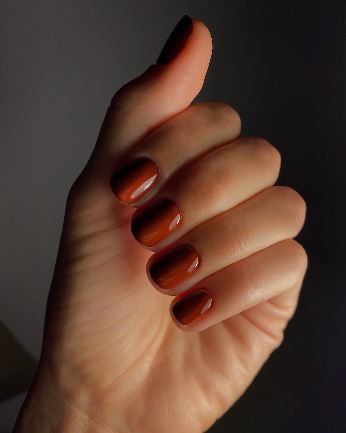 Терракотовый — король осенней палитры. Теплый, насыщенный и естественный, он сочетает в себе коричневые и оранжевые подтоны, создавая ощущение уюта. В 2025 году терракота особенно модна в глянцевом покрытии или в тандеме с золотыми акцентами.