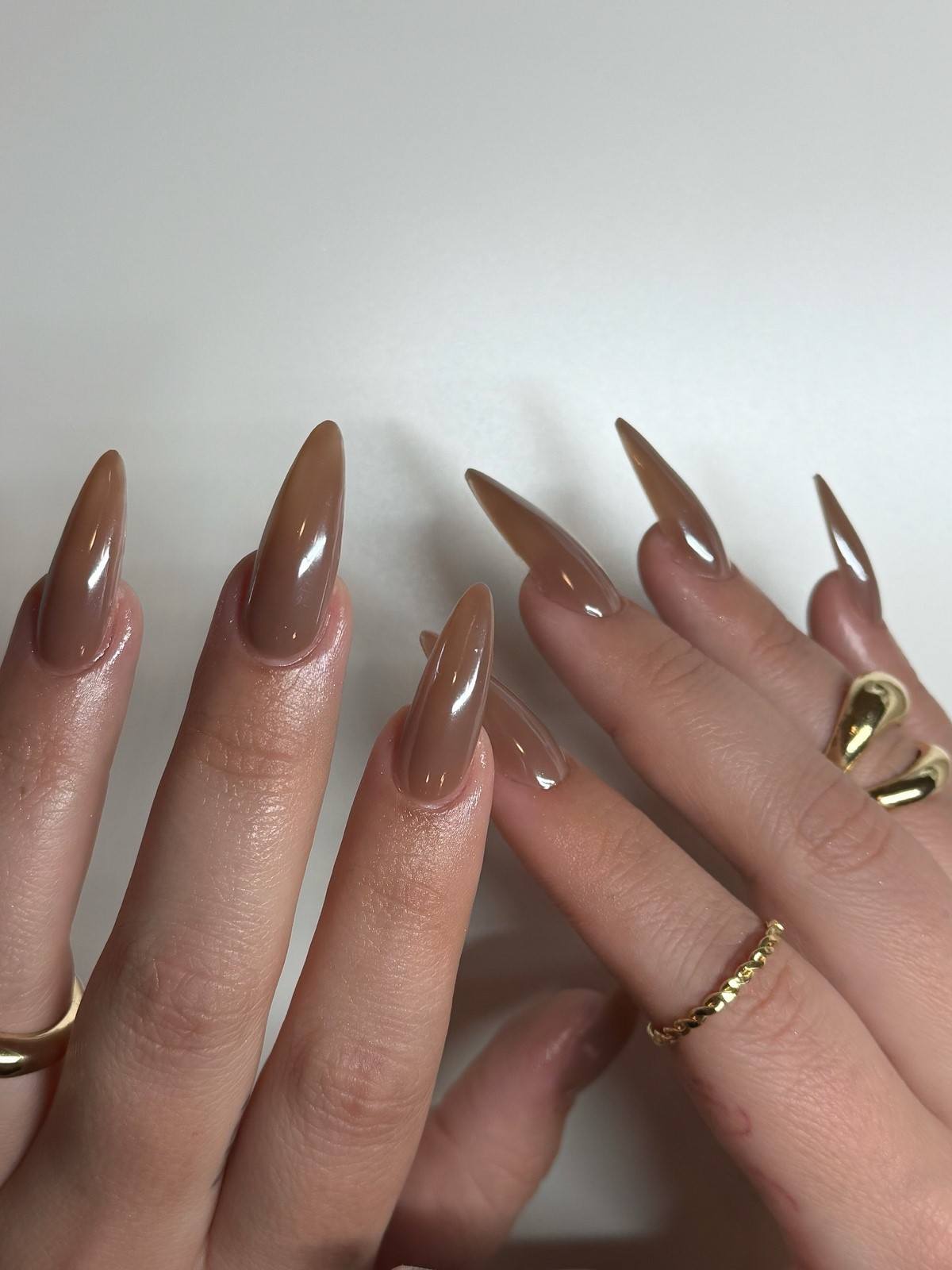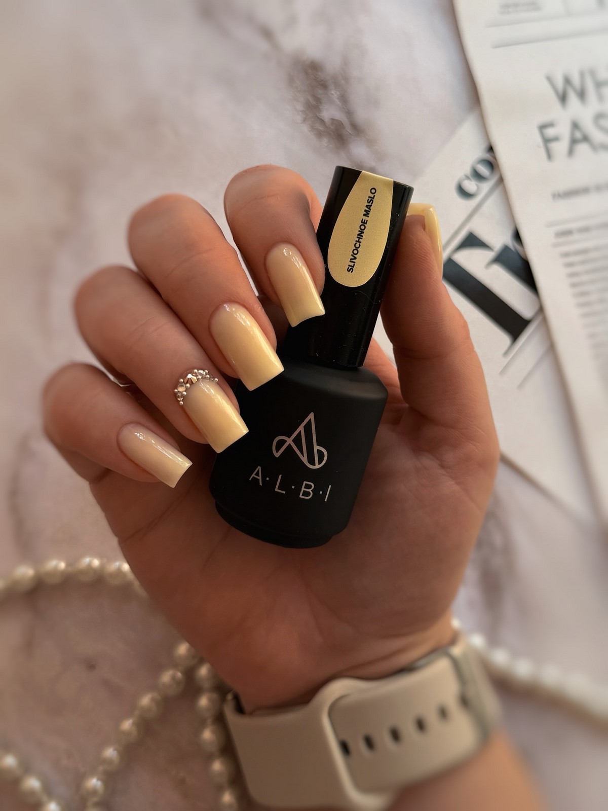 Бежевый остается вне времени. В этом сезоне он проявляется в теплых карамельных и песочных тонах. Такой маникюр — выбор для тех, кто ценит естественность и легкость. На фоне мягкого бежа хорошо смотрятся глянцевые и жемчужные покрытия.