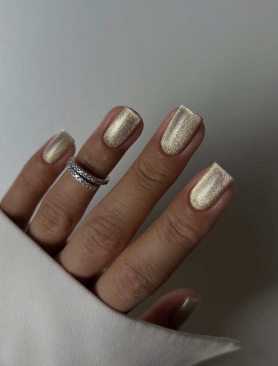 Золотой френч в технике кошачий глаз становится настоящим украшением зимнего маникюра. Металлизированная линия улыбки создает эффект жидкого золота, красиво переливающегося при движении руки. Такой дизайн выглядит празднично, но при этом сохраняет элегантность.