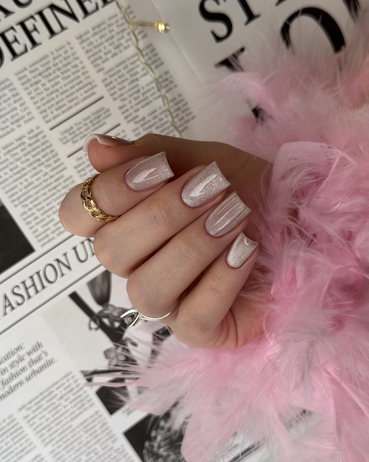 Бархатный нюд — один из самых изысканных трендов зимы 2026. Он создает эффект мягкого свечения и визуально напоминает кашемир или велюр, идеально сочетаясь с квадратной формой ногтей. Оттенки варьируются от теплого бежа до холодного розово-молочного, подчеркивая естественную красоту рук.