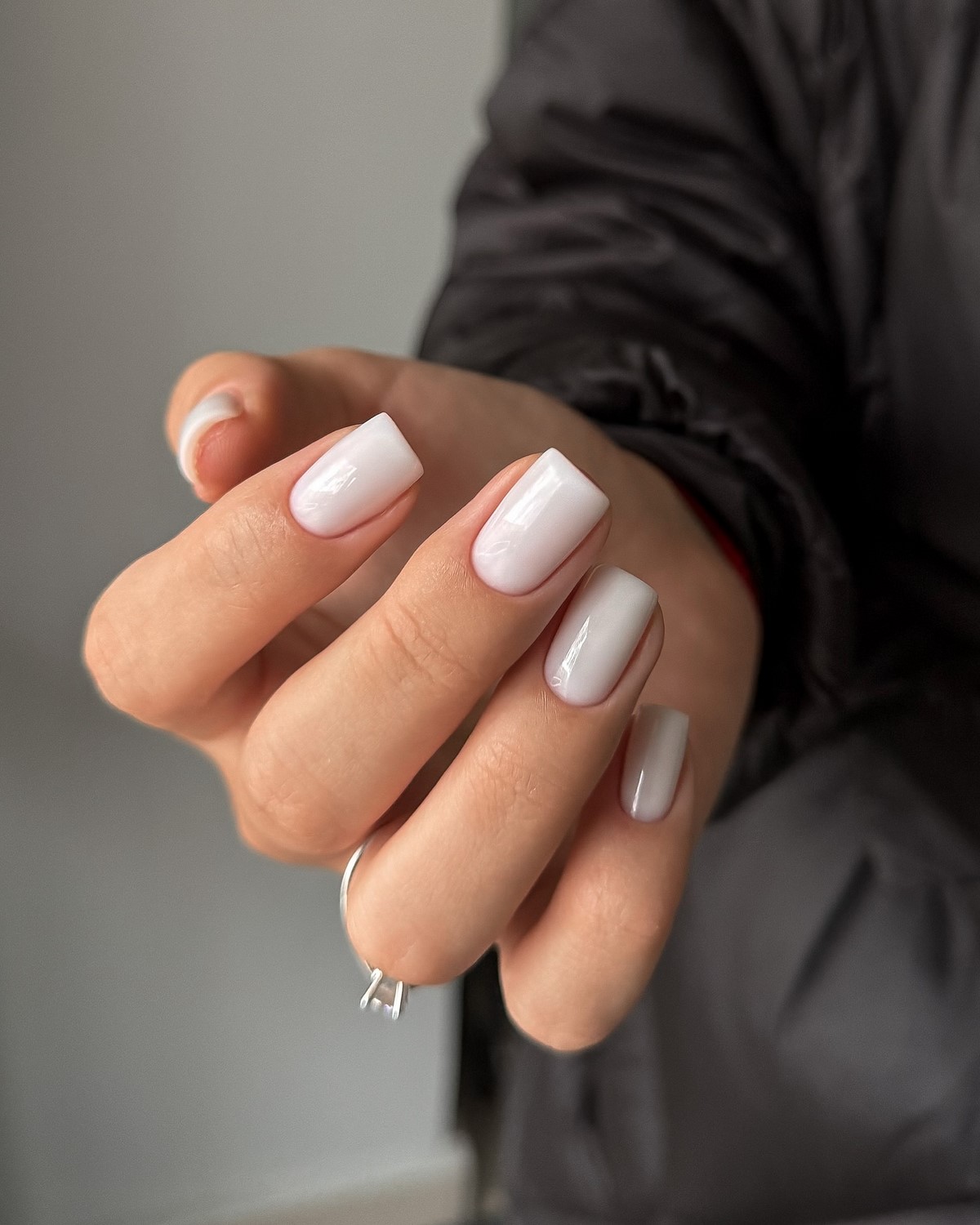 Оттенок Cloud Dancer стал настоящим символом зимы 2026. Это не просто молочный цвет, а сложный полупрозрачный тон с холодным подтоном, создающий ощущение чистоты и свежести. На квадратных ногтях он выглядит особенно аккуратно и современно.