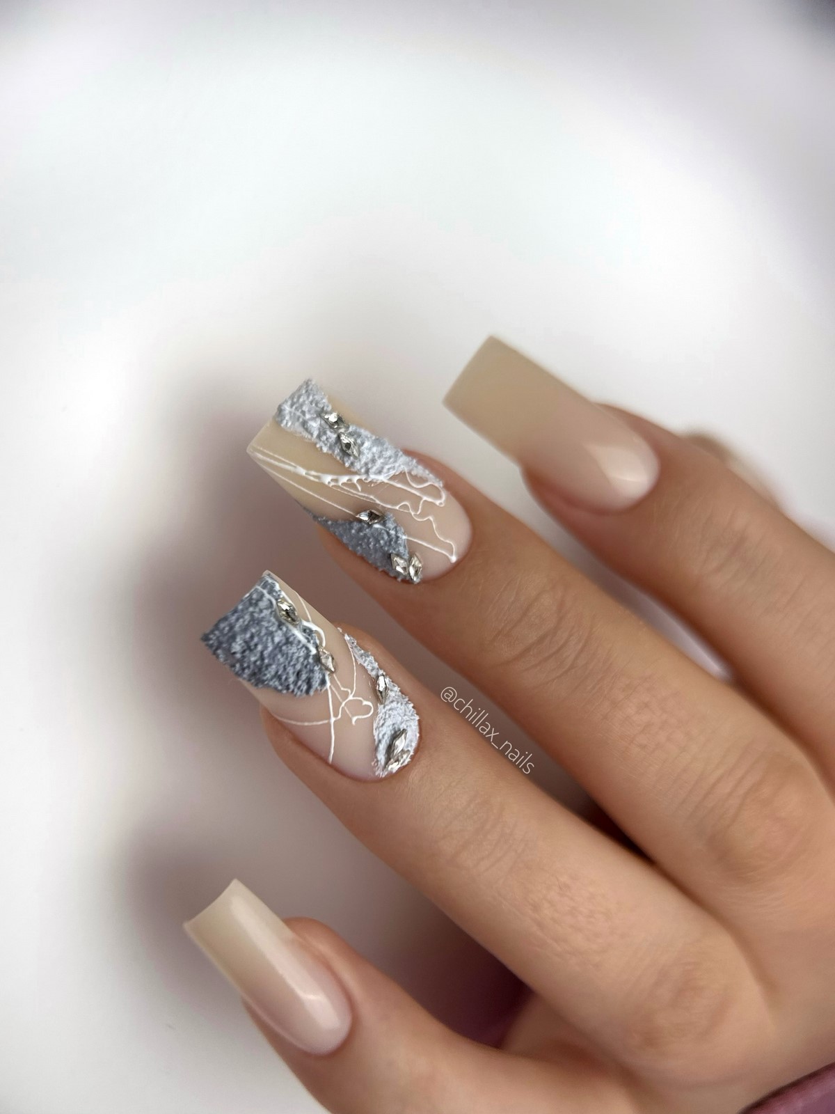 Тактильные текстуры — ключевой тренд зимнего дизайна 2026. Эффекты штукатурки, песка, инея и мягкого рельефа создают визуальную глубину и делают маникюр настоящим арт-объектом. На квадратных ногтях такие дизайны выглядят структурно и гармонично.