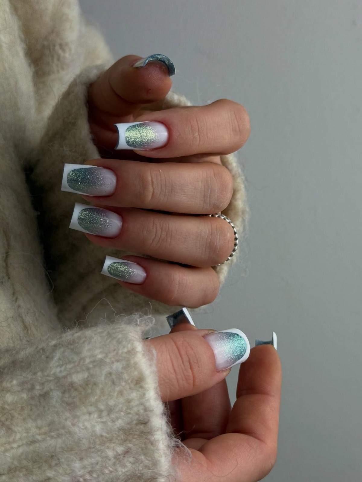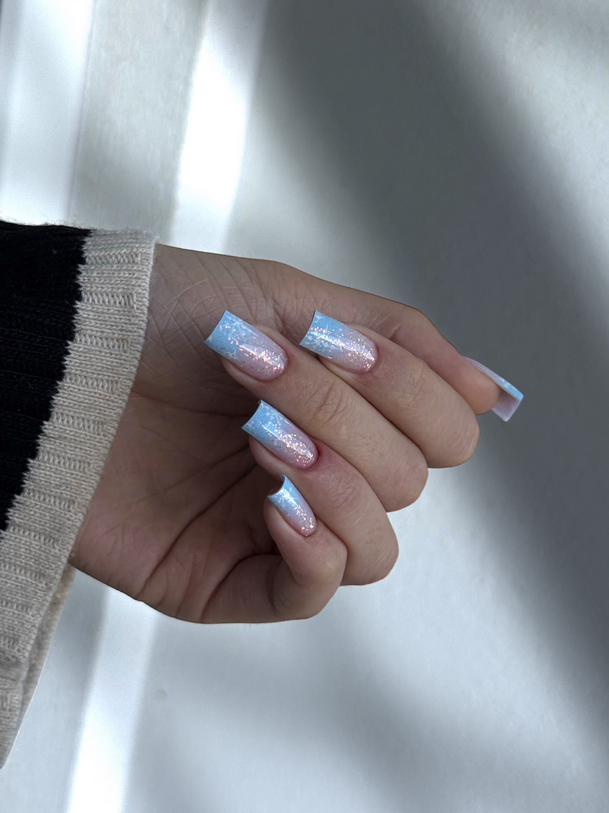 Зимний градиент 2026 становится более утонченным. Вместо ярких переходов — мягкое перетекание молочного оттенка в холодный голубой на кончиках ногтей, дополненное деликатными блестками. Такой дизайн напоминает морозный иней и идеально вписывается в зимнюю эстетику.