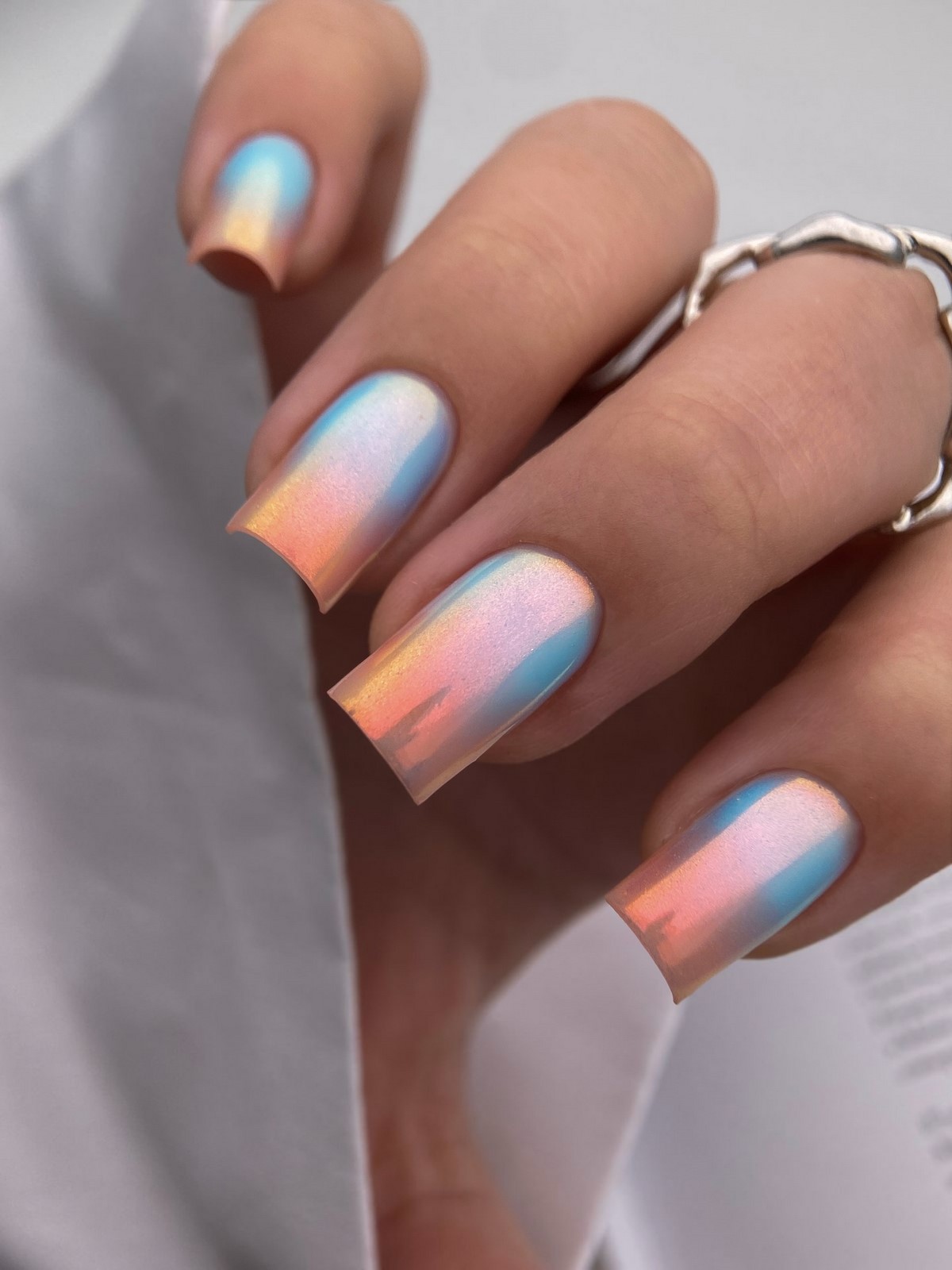 На квадратных ногтях градиент смотрится особенно четко благодаря ровной линии свободного края. Это отличный вариант для праздничного маникюра без излишней вычурности.