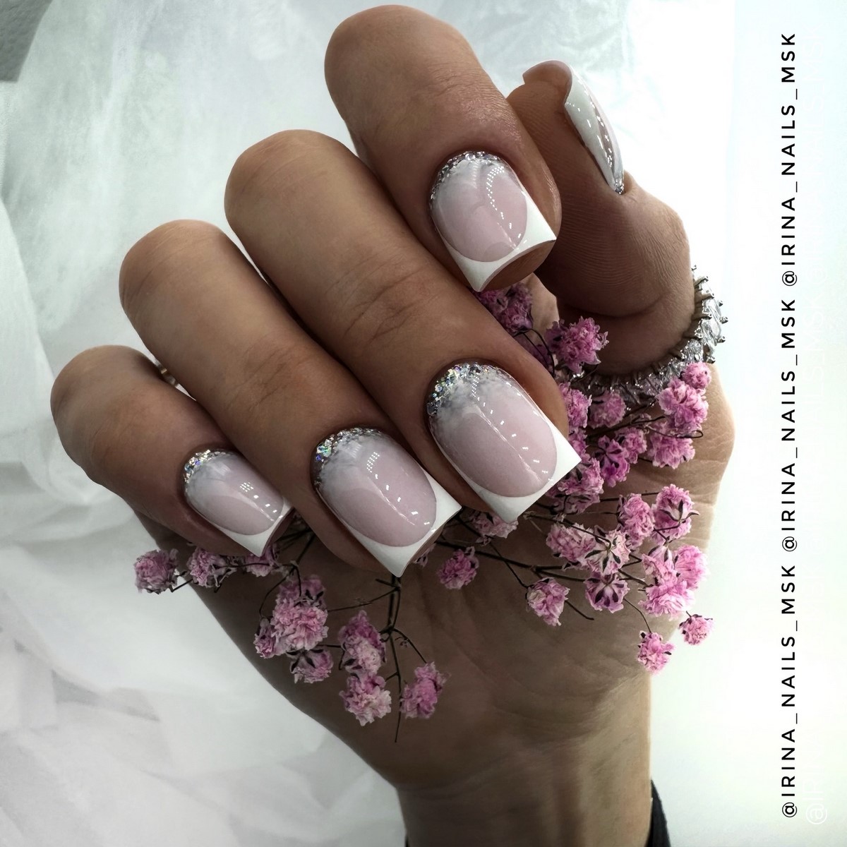 Глазированный френч — современная интерпретация классики. В зиме 2026 он выполняется в молочных, перламутровых и холодных оттенках с эффектом стеклянного блеска. Квадратные ногти подчеркивают четкость линии френча и делают дизайн максимально аккуратным.