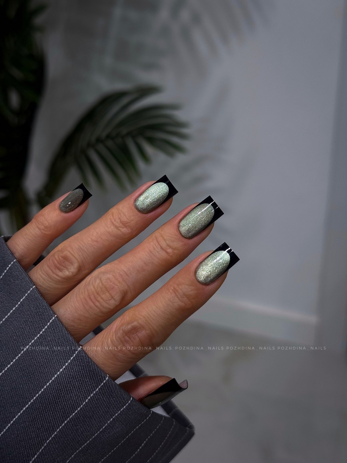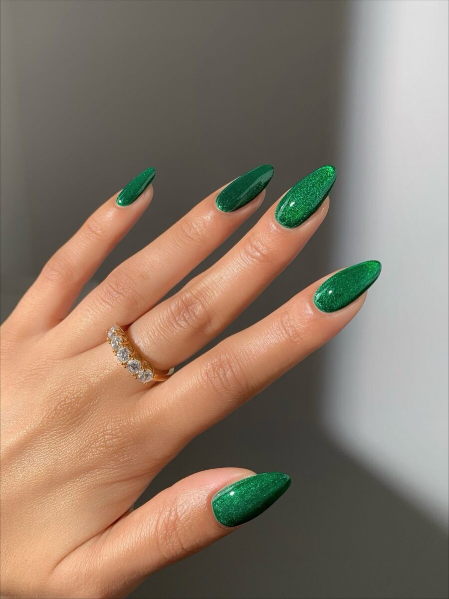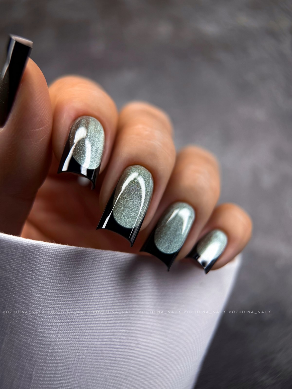 Зеленый Cat Eye смотрится загадочно и дорого, при этом не требует дополнительного декора. Он хорошо сочетается с миндалевидной и овальной формой ногтей, подчеркивая их изящество.