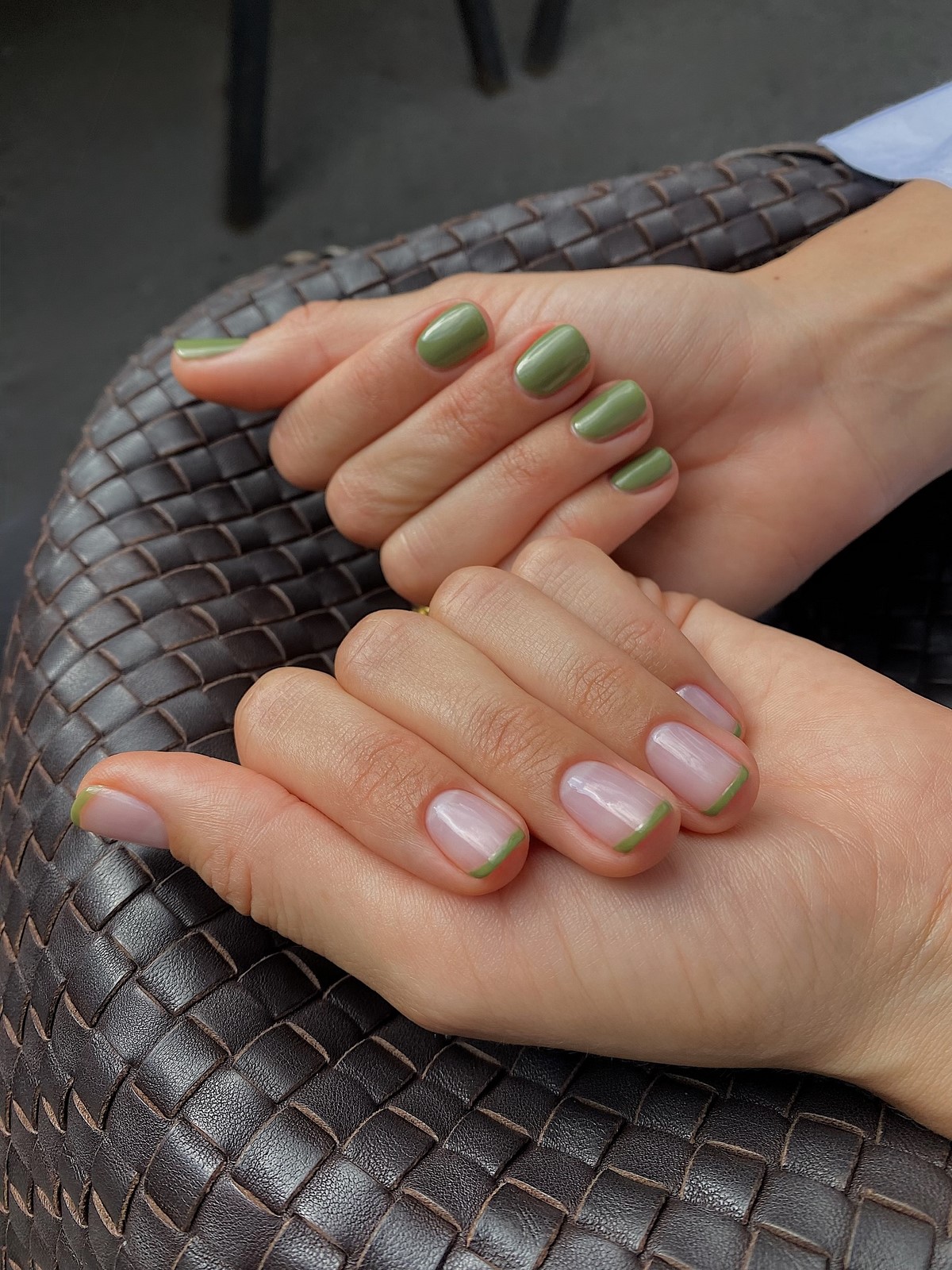 Форма линии может быть классической, диагональной или слегка размытый контур. Особенно эффектно зеленый френч смотрится на молочной и полупрозрачной базе, подчеркивая чистоту маникюра.