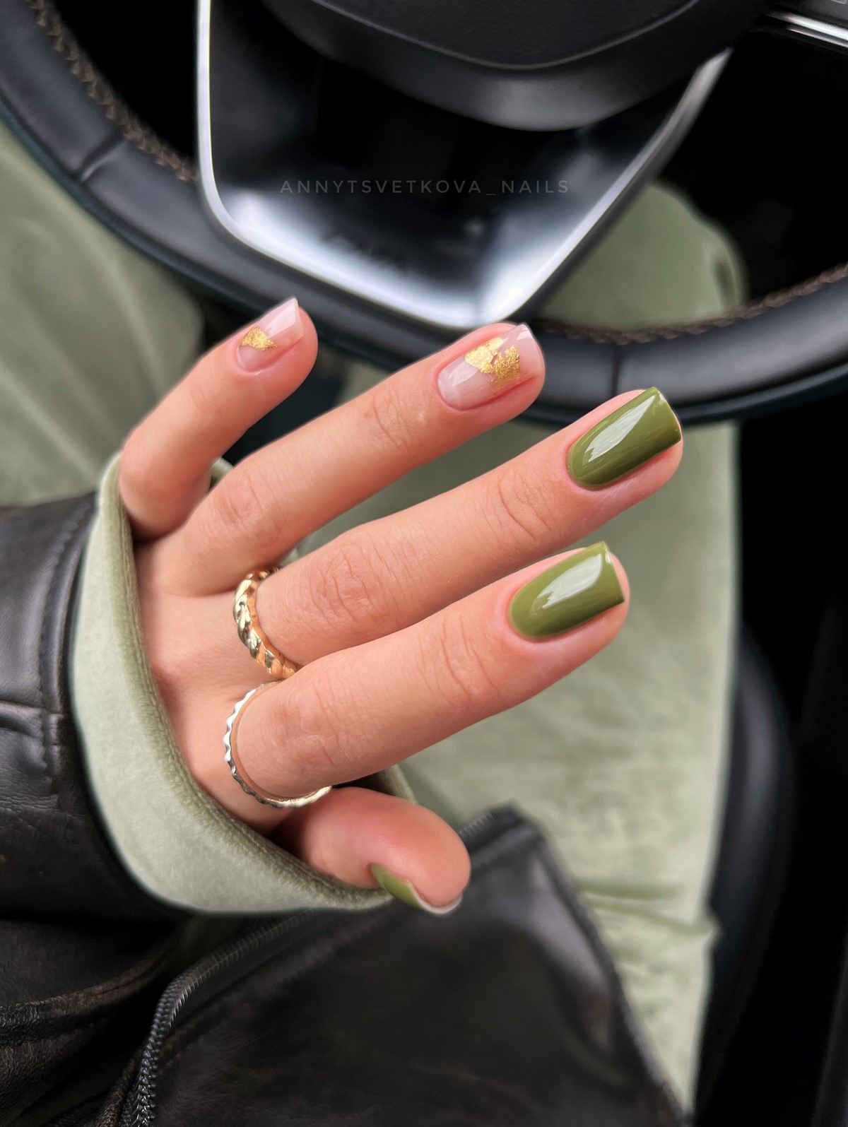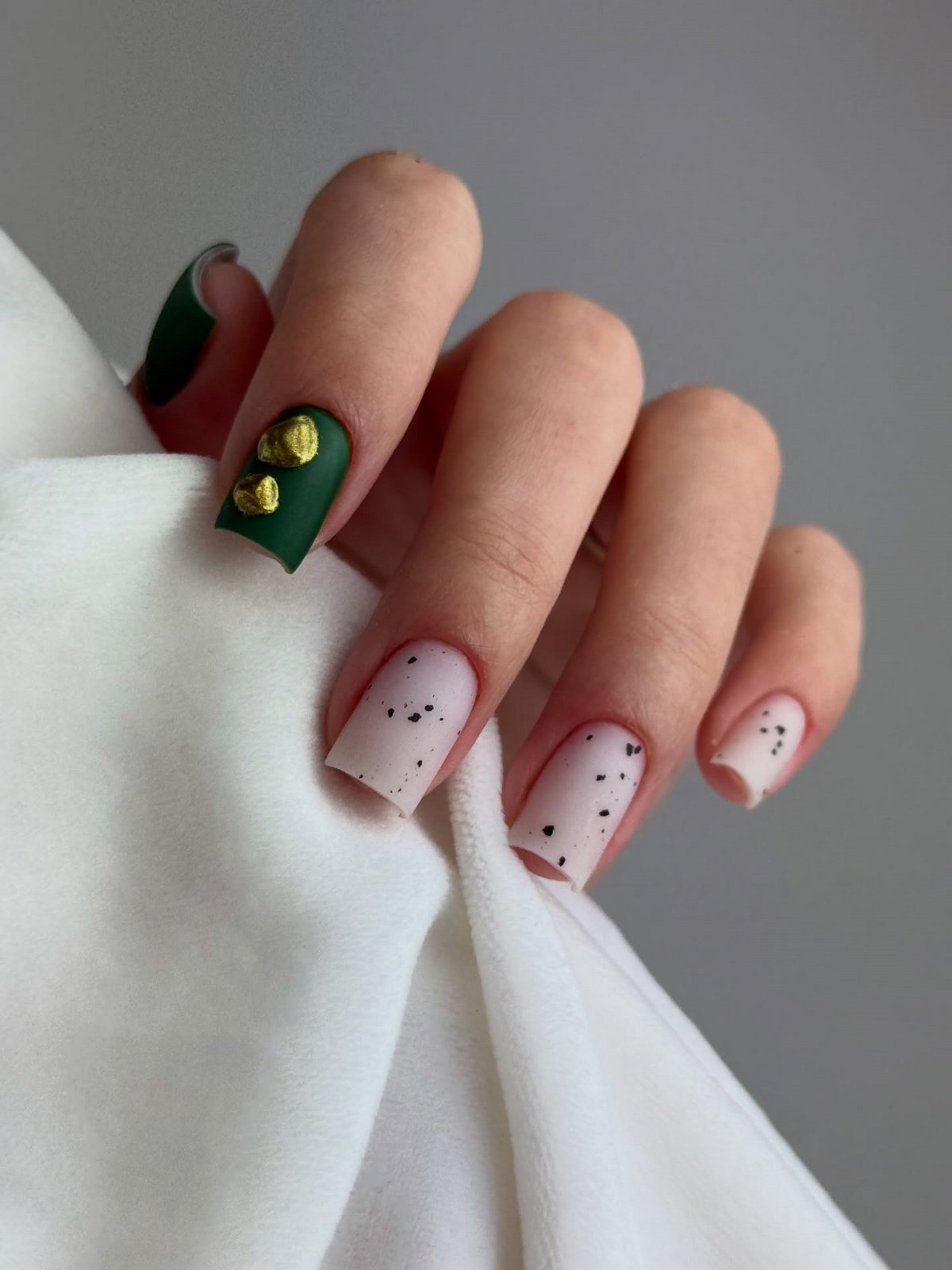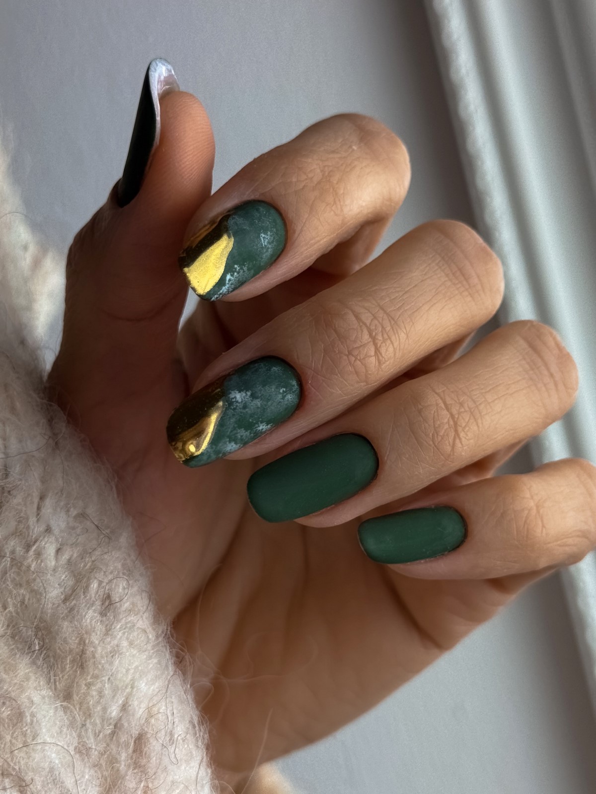 Матовый зеленый маникюр с элементами жидкого золота становится настоящим символом зимней роскоши. Контраст бархатистой поверхности и текучих золотых линий создает эффект дорогого и продуманного дизайна. В моде асимметричные мазки, абстрактные вкрапления и легкие рельефы.