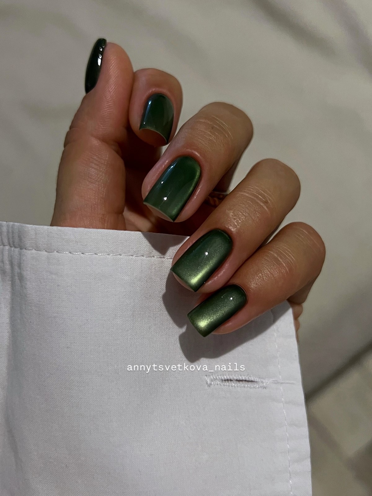Эффект кошачьего глаза в зеленой гамме становится одним из самых востребованных трендов зимы 2026. Магнитное сияние создает глубину цвета и эффект внутреннего свечения, который особенно красиво раскрывается в темных оттенках.