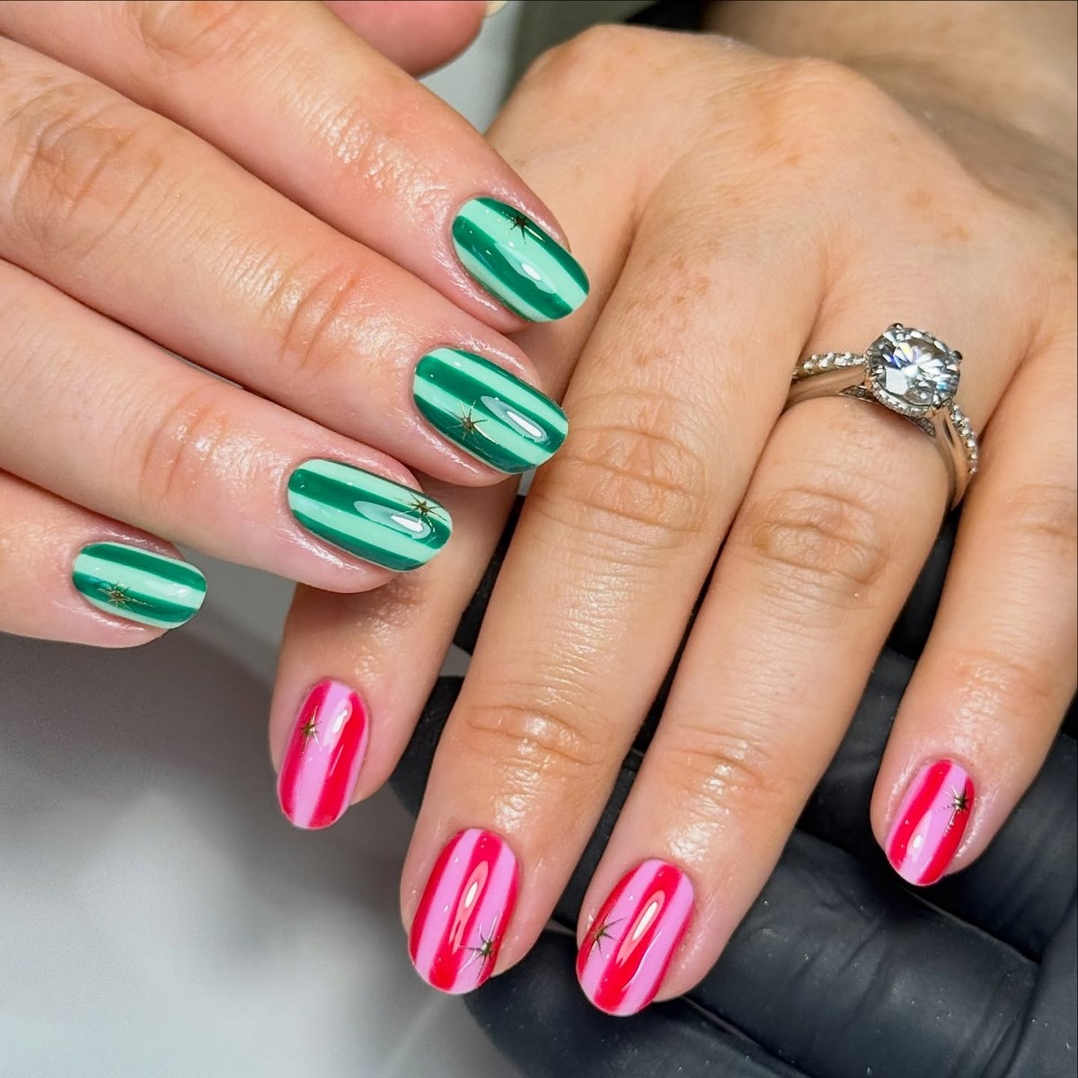 Полоски в зеленом маникюре приобретают более тонкое и выверенное исполнение. В тренде вертикальные линии, которые визуально вытягивают ногтевую пластину и делают маникюр аккуратнее. Цвет полос может быть контрастным или выполненным в нюансных оттенках зеленого.