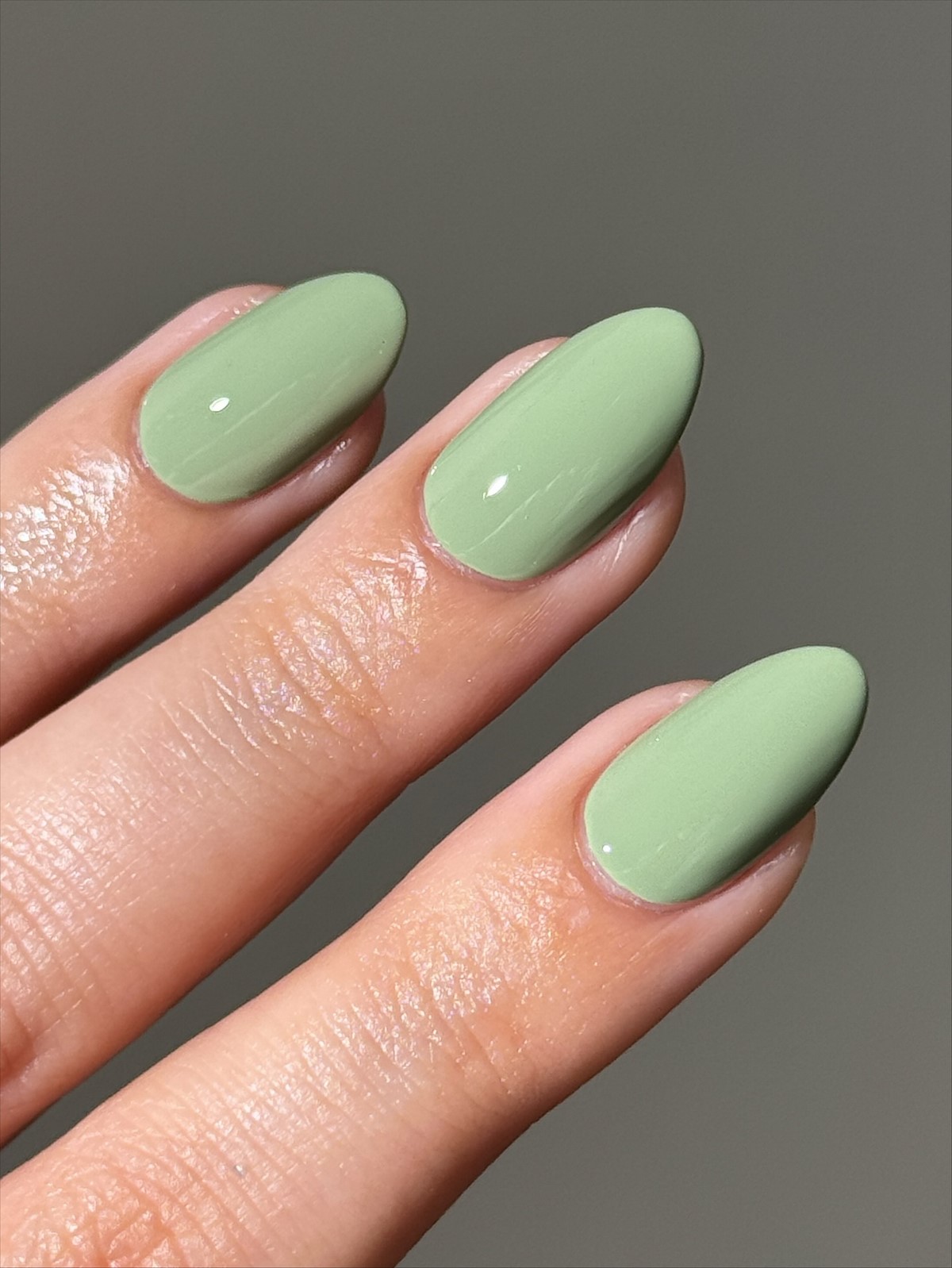 Глазированный эффект остается актуальным и зимой 2026, но в более спокойной и холодной интерпретации. Зеленая база с полупрозрачным сиянием создает эффект стеклянной поверхности и выглядит очень современно.