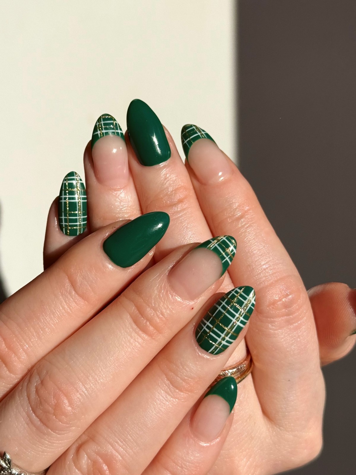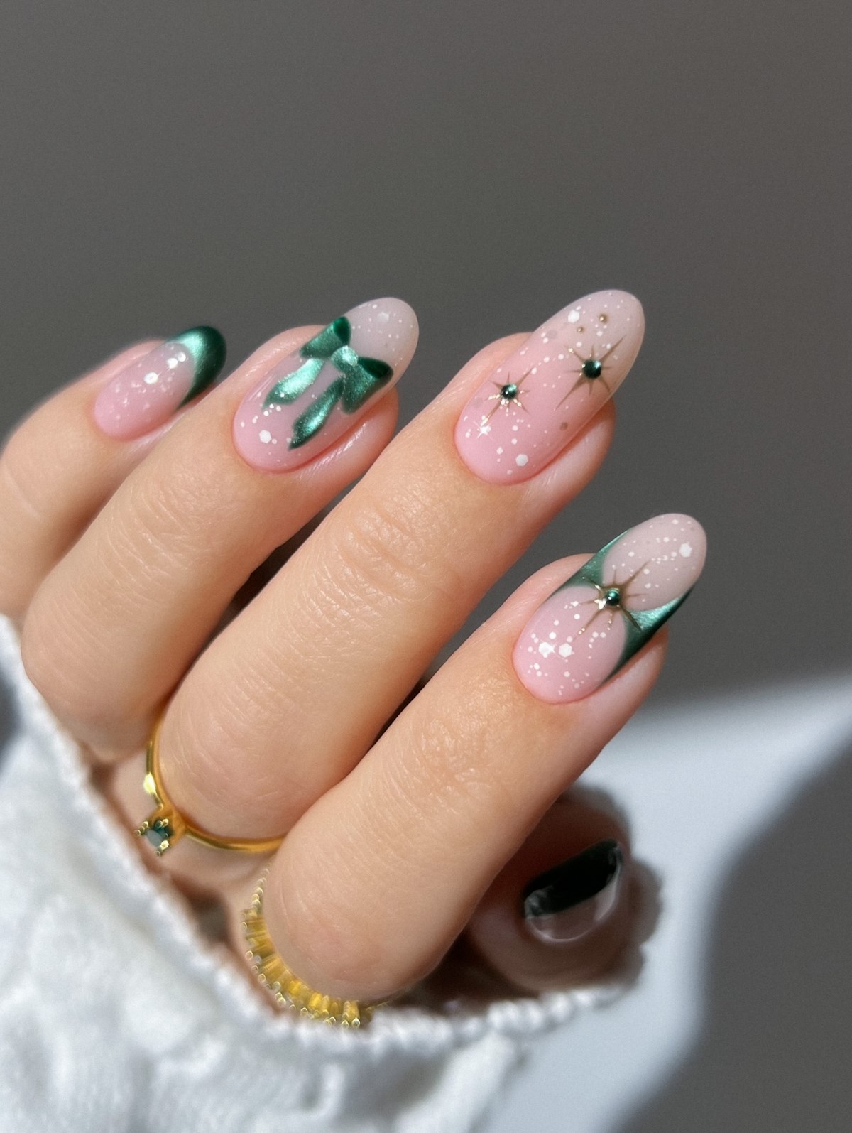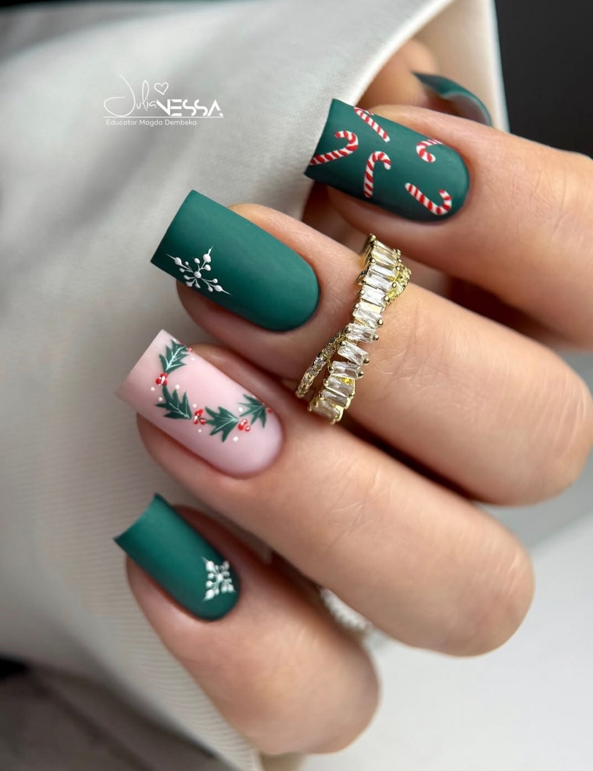 Он перестает быть только акцентным и превращается в полноценную базу для стильных и выразительных дизайнов. Глубокие хвойные, мягкие оливковые, холодные изумрудные и приглушенные мшистые оттенки гармонично сочетаются с зимними образами и выглядят дорого даже в минималистичном исполнении.