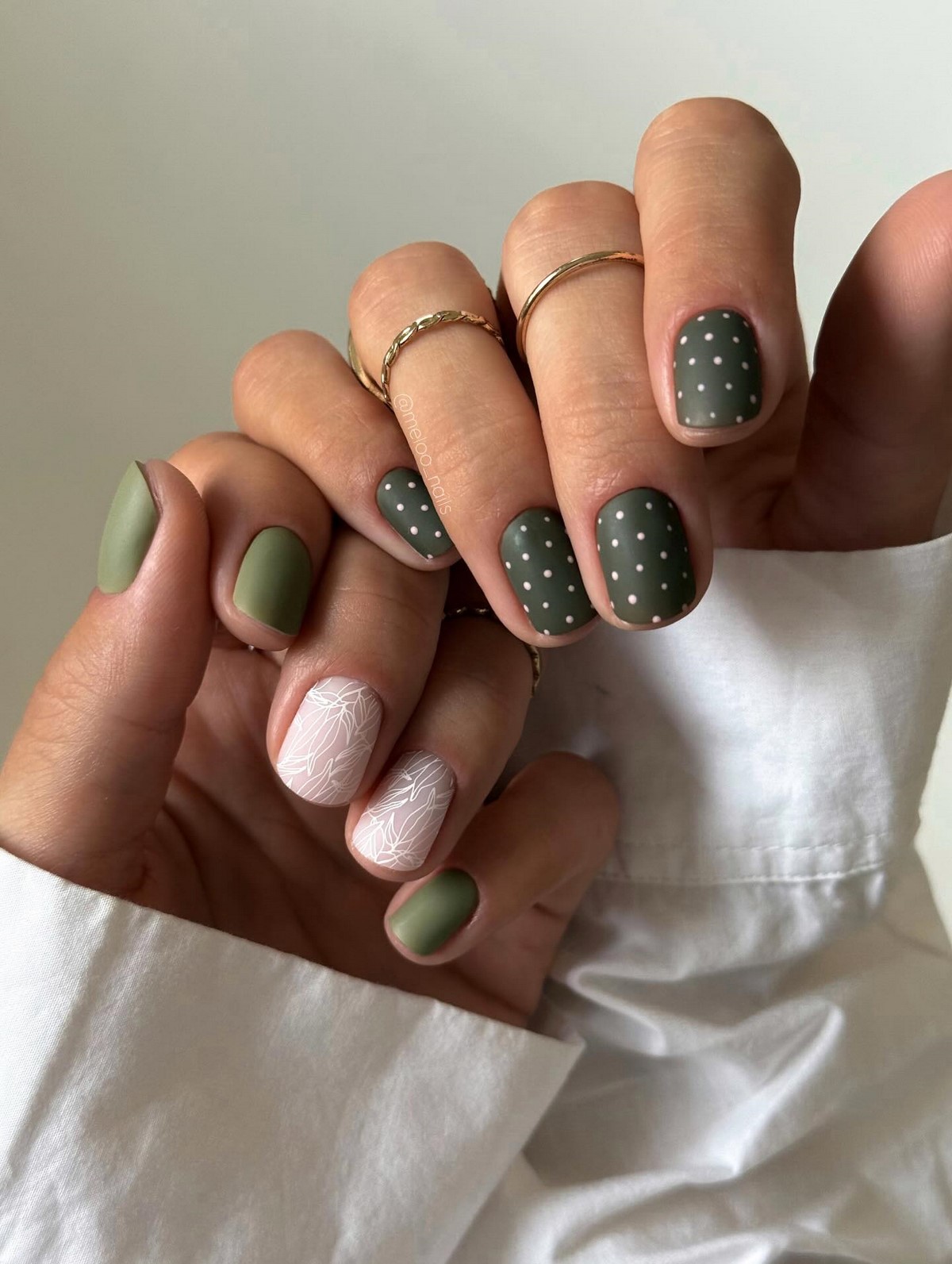 Горошек возвращается в моду в обновленном виде. Зимой 2026 Polka Dots в зеленом маникюре выглядит сдержанно и стильно, без игривой наивности. Точки выполняются в контрастных оттенках, таких как молочный, золотистый или темно коричневый.
